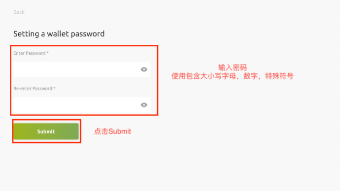 3. 设置密码,需要包含大写字母,小写字母,数字和特殊符号,点击Submit