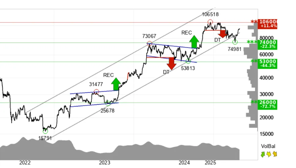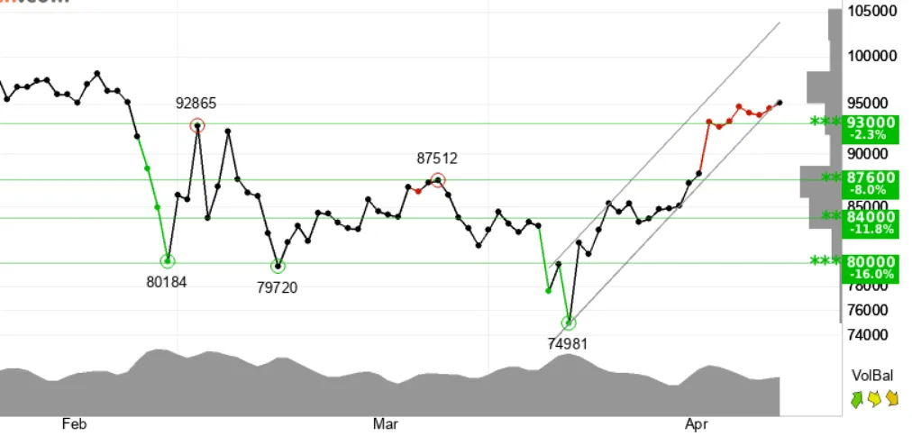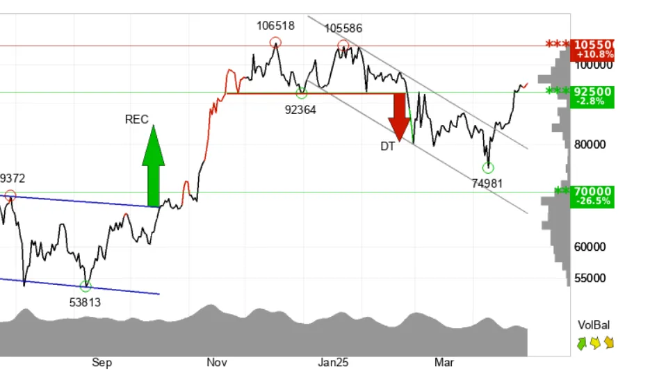 比特币已突破中长期下跌趋势的上限,这意味着初始下跌速度有所放缓。价格在突破双顶形态后触及80521的目标位后有所回调。大幅突破92364将再次给比特币带来新的负面信号,而突破形态的反方向则将是一个强烈的正面信号。比特币已突破92500的阻力位,预示着进一步上涨。比特币短期势头强劲,RSI高于70。这表明投资者的乐观情绪正在增强,比特币价格有望进一步上涨。然而,尤其是对于大型股而言,高RSI可能预示着股价超买,并可能出现回调。总体而言,从技术角度来看,比特币中长期走势略为积极。