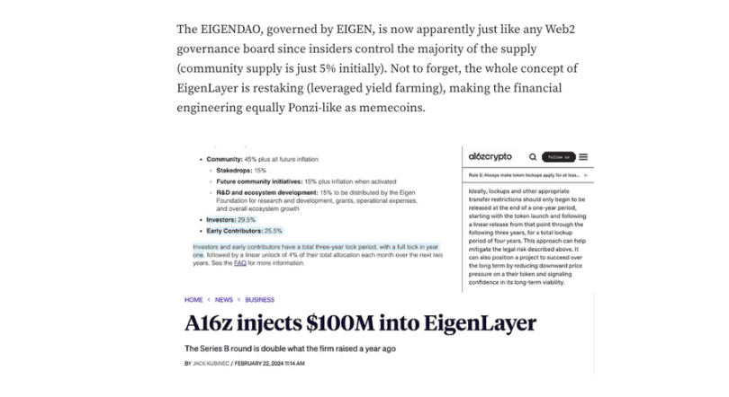 以 EigenLayer 为例——典型的低流动、高 FDV 游戏,由拥有 29.5% 股权的 VC 支持。内部人士(VC 和团队)持有份额相当大,达到 55%。上一个周期,我们责怪 FTX/Alameda,但这个周期我们并没有好到哪里去。