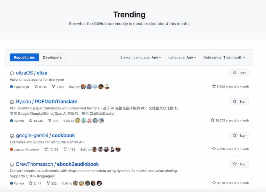 ai16z 以其 Eliza 代理框架的卓越表现,成为了 AI 代理领头羊。最近一个月,Eliza 在GitHub 趋势榜上表现亮眼,攀升至趋势榜榜首,新增 6532 颗星标,累计达到 9600 颗星标。
