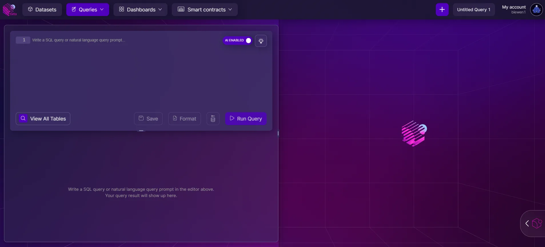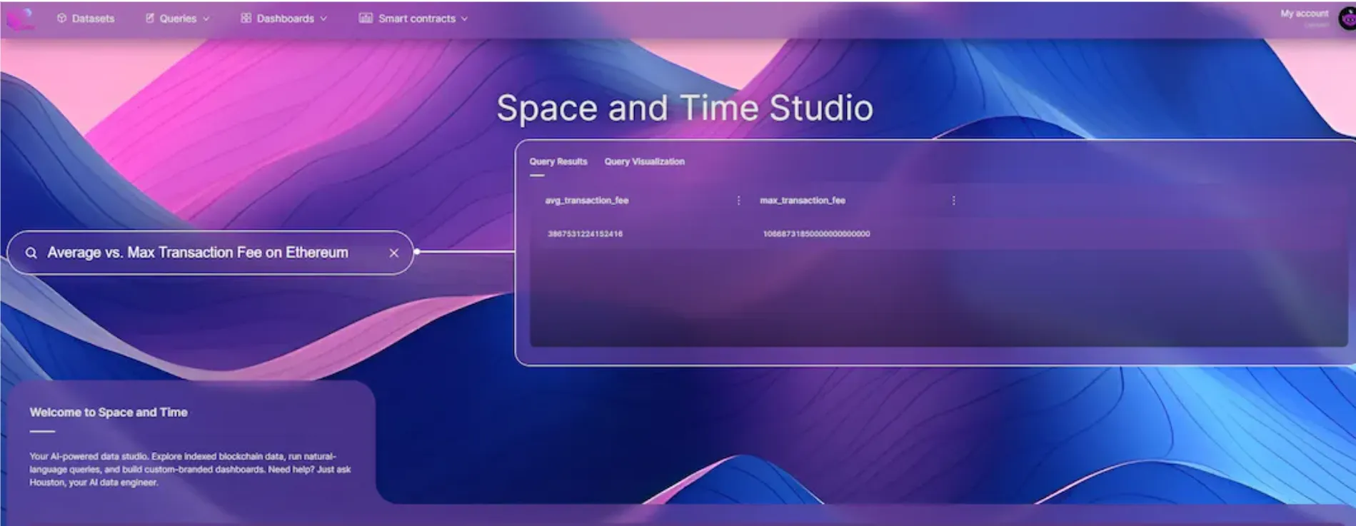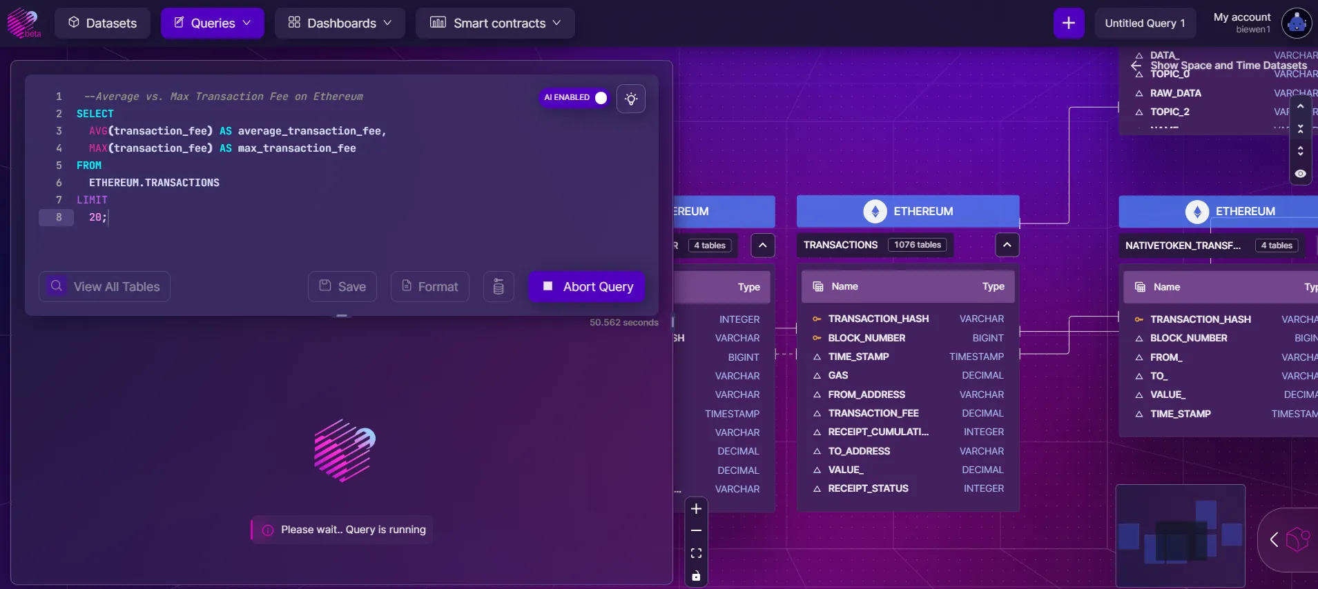 我们的第一个应用是 AI-powered data studio。在输入框中,只需输入您感兴趣的问题,例如在 "Ask Any query" 中输入:"Average vs. Max Transaction Fee on Ethereum"。