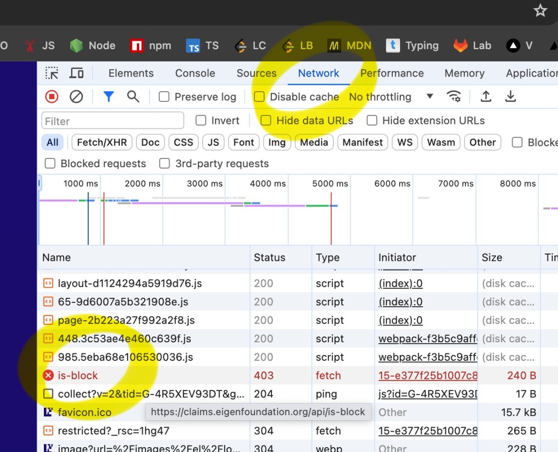 而且以往的地理封锁往往是表面功夫,挂上其他国家的 VPN,仍然可以正常申领代币。而 EigenLayer 不一样,它动「真格的」了。笔者亲身经历,以前无往不利的代理居然被检测出并屏蔽了,这是它第一次失灵。很是折腾了一番,才绕过地理封锁查询到份额。(教程在最后)