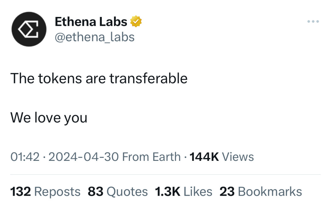 这除了引发社区进一步的不满外,之前进行了大规模空投的 Ethena 也发文写到:「我们的代币是可以转移的,我们爱你。」疑似对此事进行嘲讽。