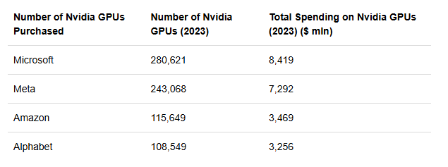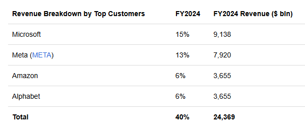 微软、Meta、亚马逊和Alphabey这四大科技巨头,贡献了英伟达2024财年收入的40%,总额高达243.69亿美元。这种高度集中的营收结构也表明,这些客户的资本支出计划对于英伟达未来的表现至关重要。