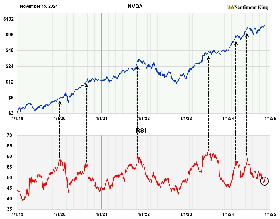 通常情况下,RSI在45以下被视为强烈的中期买入信号,而价格峰值往往出现在RSI读数达到58或更高时。这表明英伟达股价仍有一定的上升空间,尤其是在未来几个月。