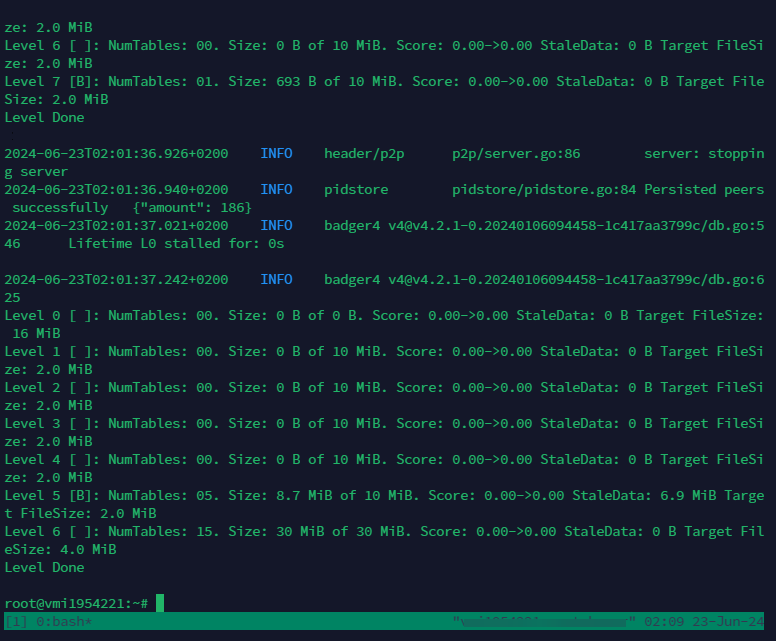 ระบบจะเปิด session จาก tmux ขึ้นมา ในกรณีนี้คือต้องการปิด session ที่กำลังรันโหนด ให้กด Ctrl+C เพื่อหยุดการรันโหนด จะได้ดังรูป