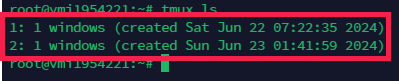 หากเราใช้ tmux ในการรันหลาย session แล้วต้องการปิด session ที่ไม่ใช้ หรือต้องการปิดการรันโหนด ให้ลิสต์เพื่อดู session ทั้งหมดก่อนจากคำสั่ง tmux ls
