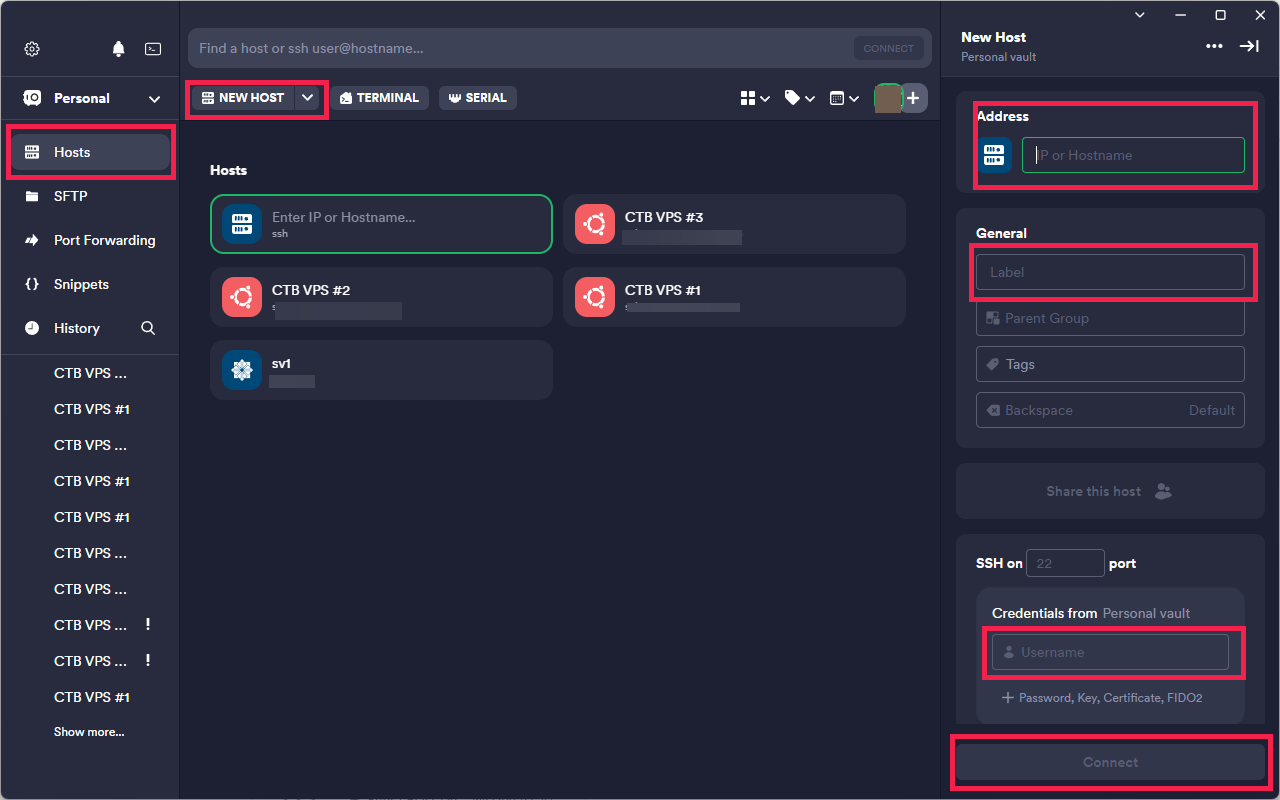 ╰ กด Host > New Host > กรอก IP ที่ได้จากหน้า VPS Control > ที่ General ตั้งชื่อ VPS ตามต้องการ > Credential ใส่ root > กด connect