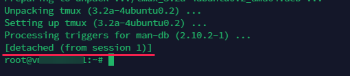 กด Ctrl+B ตามด้วยกด D จะกลับหน้า terminal ปกติ ดังรูปด้านล่าง จะเห็นว่ามี Session 1 ขึ้น นั่นคือ session ที่เราเปิดรันโหนดไว้