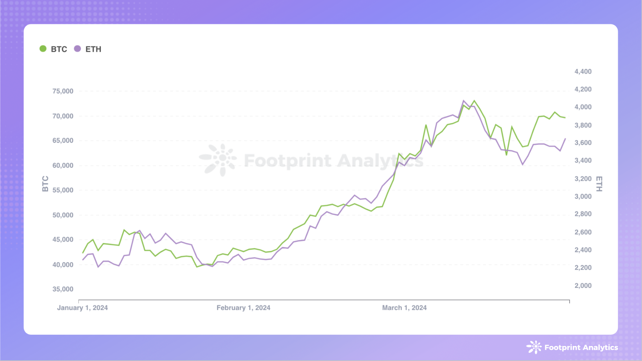 比特币的价格变动与美国比特币现货 ETF 表现紧密相关。月中价格的回落主要受到比特币现货 ETF 资金流入放缓和传统交易者降低杠杆的影响。然而,市场对 4 月份比特币减半事件的期待为其维持了上涨势头。