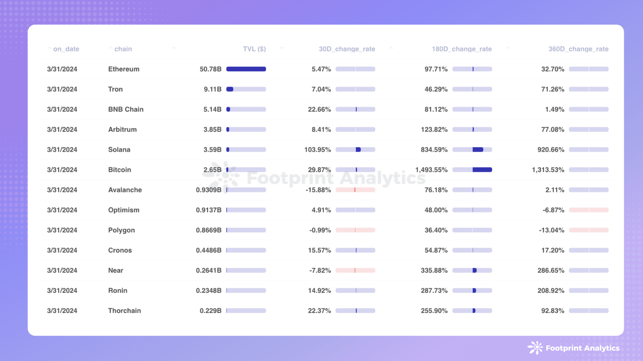 3 月底,公链 TVL 达到 81.3 亿美元,以太坊、Tron 和 BNB 链位列前三。