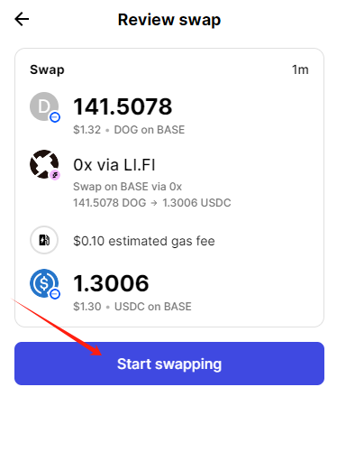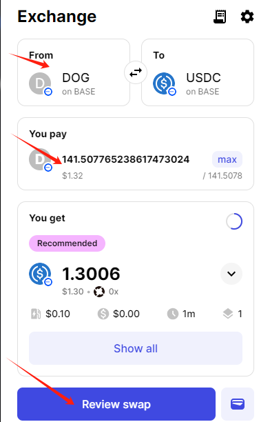 步骤3:点击Swap,会跳出一个换币的界面,在第一行需要输入自己钱包有的币,第二行需要输入自己要换的币,第三行会显示自己钱包币的金额,在点击Exchange,再一次点击Review swap,再继续点击staet swapping,会跳出钱包界面。