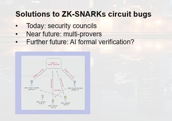 第二个问题是安全问题,就是bugs, bug 是人们很少谈论的最大问题之一,但它却非常重要,基本上,我们拥有所有这些令人惊叹的加密技术,但如果人们担心电路中存在某种缺陷,就不会相信它们,无论是 zK-SNARK 还是 zkEVM,它们都有 7000 行代码。这还是在非常高效的情况下。平均而言,每千行代码就有 15 到 50 个漏洞。在以太坊中,我们很努力,每千行代码中的错误少于 15 个,但多于零。如果你有这些持有数十亿美元资产的系统,那么如果其中一个系统出现漏洞,那么无论加密技术有多先进,这些钱都会丢失。