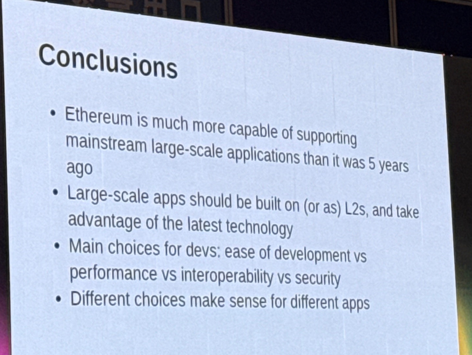 最后,他总结,以太坊现在已经比五年前能够更scalble的支持main stream的大规模应用。而大规模的应用也应该是构建在L2上的,可以leverage最新科技的好处。当develper选择什么样的方式构建应用程序时,需要考虑开发的难易程度,性能,以及interoperability and security等。而不同的选择是根据不同的应用程序情况来定的。