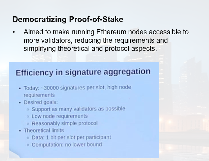 最后他提到如何使PoW能够更民主化,现在以太坊有 3 万个验证器,运行一个节点的要求很高,Vatalik的笔记本电脑上就有一个以太坊节点,它可以运行,但这可不是一台便宜的笔记本电脑,而且他还得自己去升级硬盘,以太坊的理想目标是支持尽可能多的验证器。 我们希望权益证明尽可能民主化,让人们能够直接参与任何规模的验证。我们希望运行以太坊节点的要求非常低,非常容易使用。我们希望理论和协议最大限度地简单。这里的理论限制是什么?每个参与者每个时段的所有数据需要有1比特,因为你必须广播谁参与了签名,谁没有参与签名。这是最基本的限制,超过这个限制,就没有其他限制了,计算没有下限,你可以做聚合证明,你可以做递归证明树。你可以做签名,你可以做各种聚合签名。你可以使用 STARK,可以使用基于网格的密码学,可以使用 32 位 STARK,可以使用各种不同的技术。 问题是,我们能在多大程度上优化签名聚合?这就是点对点安全,人们对点对点网络考虑不够。在加密领域,人们往往倾向于在点对点网络之上创建花哨的结构,然后就认为点对点网络可以正常工作。 这里隐藏着很多风险,对吗?我认为这些风险将变得更加复杂,所以在 2010 年代,每个节点都能看到一切。你肯定可以进行一些攻击:有日蚀攻击,有拒绝服务攻击,有各种各样的攻击。 但是,当你有一个非常简单的网络,而网络的唯一任务就是确保每个人都能得到所有东西时,问题还是相当简单的。问题在于,随着以太坊规模的扩大,点对点网络变得越来越复杂。今天的以太坊点对点网络已经有 64 个分片了,为了进行签名聚合,为了像现在这样每个时段处理 30,000 个签名。我们有一个点对点网络,它被分成 64 个不同的子网络,每个节点只属于其中的一个或几个网络。在数据可用性采样中,这是以太坊用来为区块提供数据空间以实现可扩展性的技术。 这也取决于更为复杂的点对点架构。在这里,你看到的是一个对等节点图,在这种设置下,每个节点只能下载所有数据的 1/8。那么问题来了,这样的网络真的安全吗?你能保证它的安全性吗?你能尽可能提高保证率吗?我们怎样才能保护并提高以太坊所依赖的点对点网络的安全性? 我们需要关注的是,我们需要能达到加密技术极限的协议,我们的加密技术已经比十年前强大得多,但还可以更强大,在这一点上,我认为我们真的需要开始研究什么是上限,我们如何才能真正达到上限。 这里有两个同样重要的领域。其中之一是继续提高效率,我们希望实时证明一切。我们希望看到这样一个世界:在去中心化协议中,每一条在博客中传递的信息都会默认附加一个 zk-SNARK,以证明该信息以及该信息所依赖的一切都遵循了协议规则。 第二个前沿领域是提高安全性。从根本上说,就是要减少出错的几率。让我们的世界里,这些协议所依赖的实际技术可以是非常强大、非常值得信赖的,人们可以尽可能地依赖它。 但是,正如我们多次看到的那样,Multisignature (多重签名) 也会被黑客攻击,有很多这样的例子,这些所谓的 Layer2 项目,其中一两个项目中的币实际上是由一个多重签名控制的,但不知何故,九个签名中有五个同时被黑客攻击,导致大量资金损失,如果我们想超越这个世界,那么我们就需要相信什么是真正能够使用的技术,并真正通过加密技术来执行规则,而不是相信一小群人来确保规则得到遵守。 但要做到这一点,代码必须值得信赖。问题是,我们能让代码可信吗?我们能让网络值得信赖吗?我们能让这些产品、这些协议的经济性值得信赖吗?我认为这些都是核心挑战,希望我们能继续共同努力,不断改进。