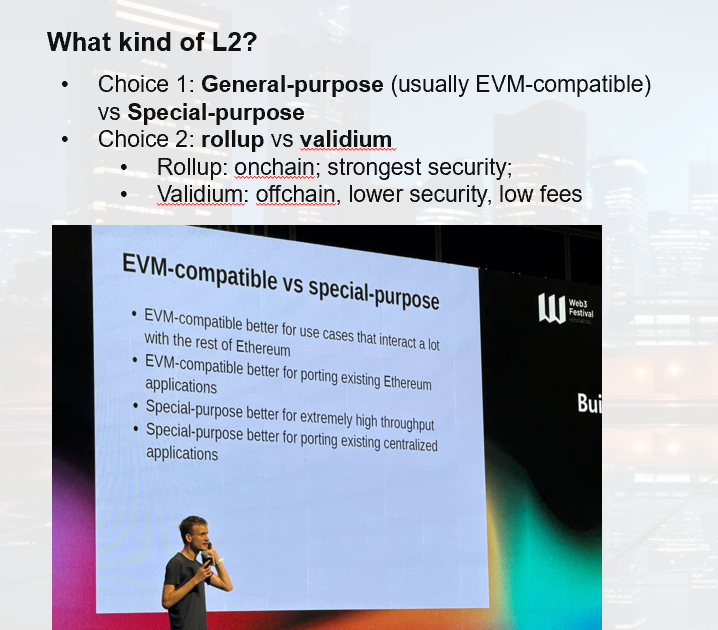 后面,Vatalik讲解了我们应该选择什么样的L2, 第一个选择是,General-purpose的,通常是EVM compatible, 可以和以太坊其他应用程序进行交互;还是special-purpose的,一般用于将web2的app引入到web3; 第二个选择是,Rollup还是Validium, Rollup是onchain进行,安全级别高,而Validium是offchain, 安全级别低,因为有可能被修改,但是gas fee低。