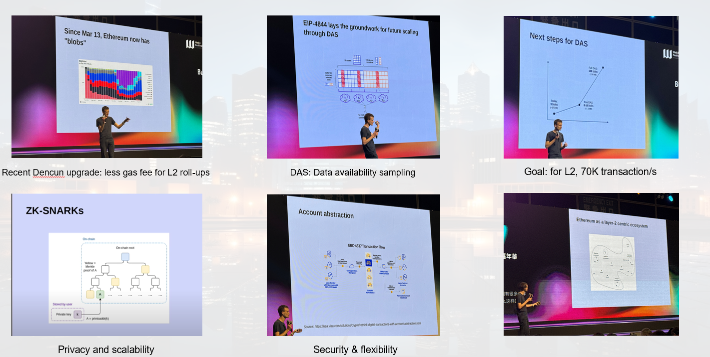 Vatalik下午的演讲主题是Building on Ethereum in 2020s, 是一篇展望未来的演讲。开场白就是大家今天享受到了更低的gas fee了么?这主要是针对三月份刚进行的Dencun升级,而他的slide的title也是Since Mar., 13, Ethereum now has blobs.