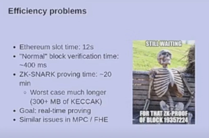 接着,他提到了目前存在的两个问题,一是efficiency, 而是安全security, 在efficiency方面,他提到目前以太坊的出块时间是12s, 验证区块的平均时间为400ms, 尽管ZK-SNARK在增强privacy和scability方面有着出色的表现,但是efficiency确实一个很大的挑战,目前它的验证时间是20 mins, 而我们的目标是做到real time proving, 尽管MPC, FHE (全同态加密)以及BLS (聚合加密)得到了广泛的应用,但是也存在efficiency的问题。