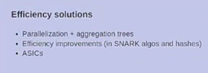 解决efficiency的问题有三个方面:1)Parallelization + Aggregation trees; 2)Efficiency improv. In SNARK algos and hashes; 3)ASICs.