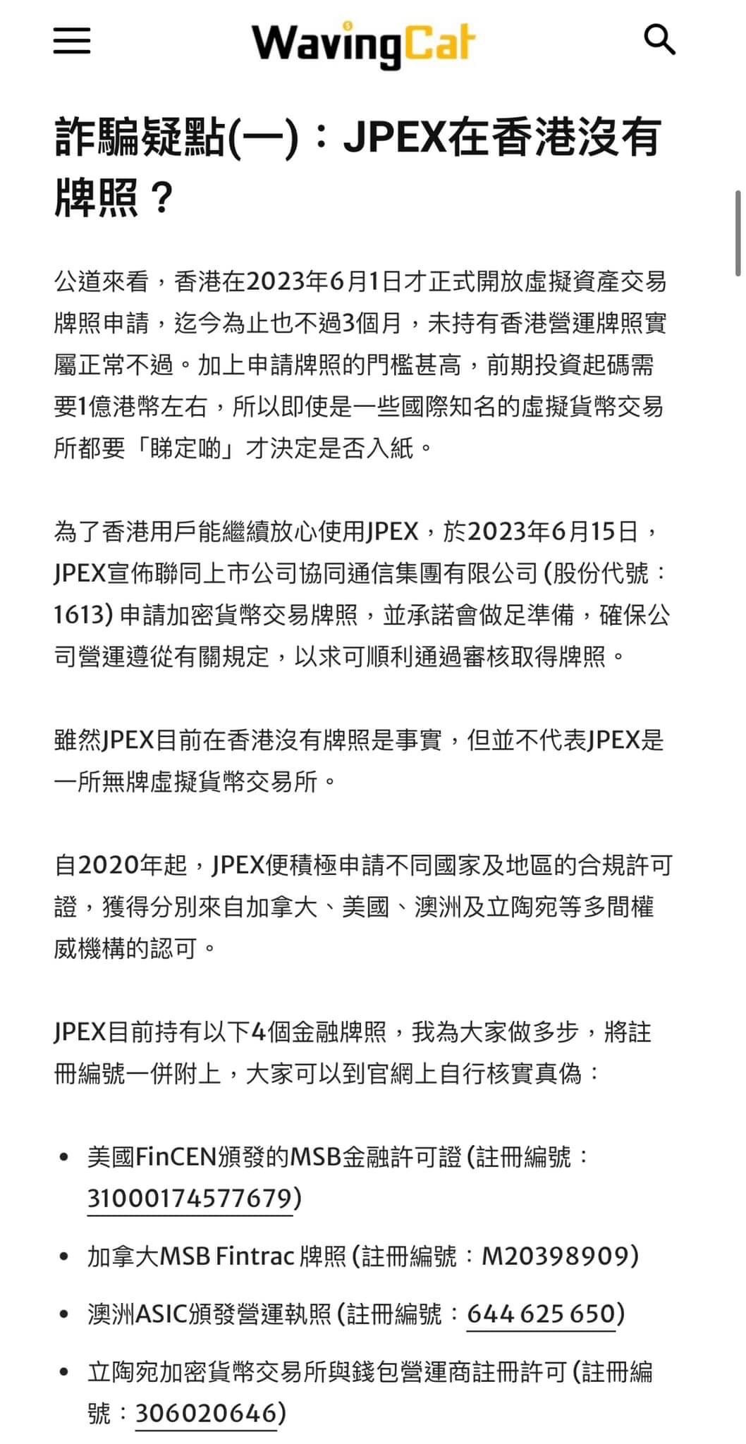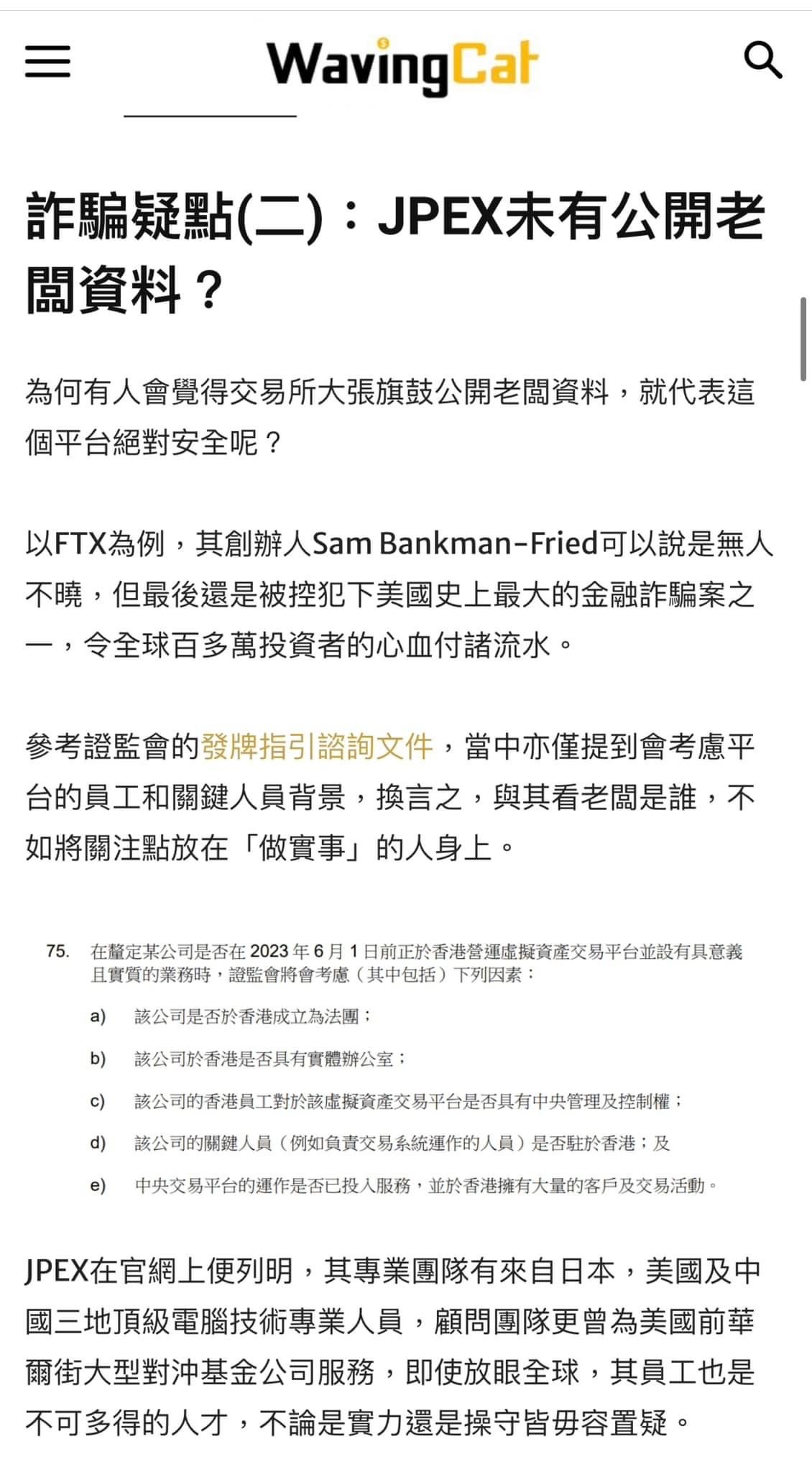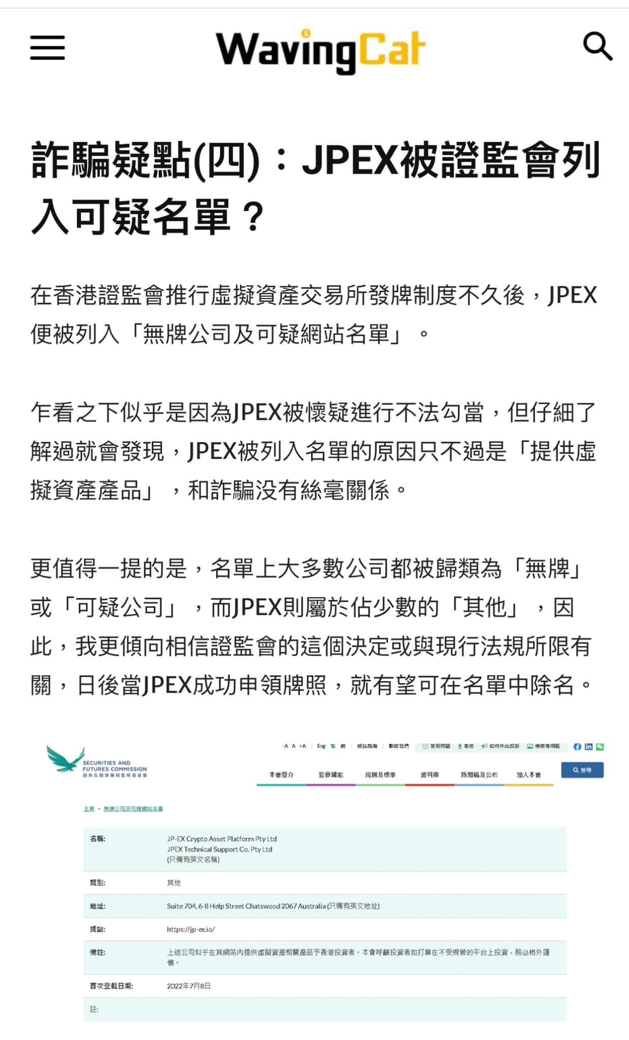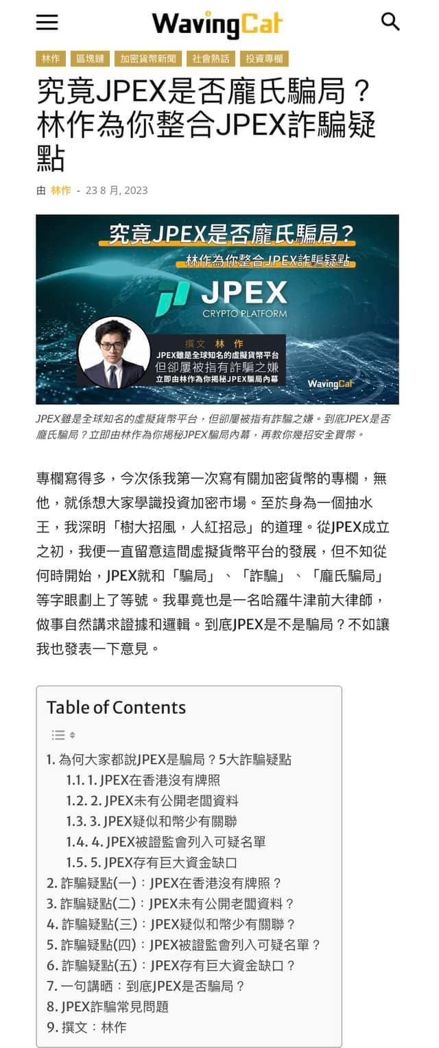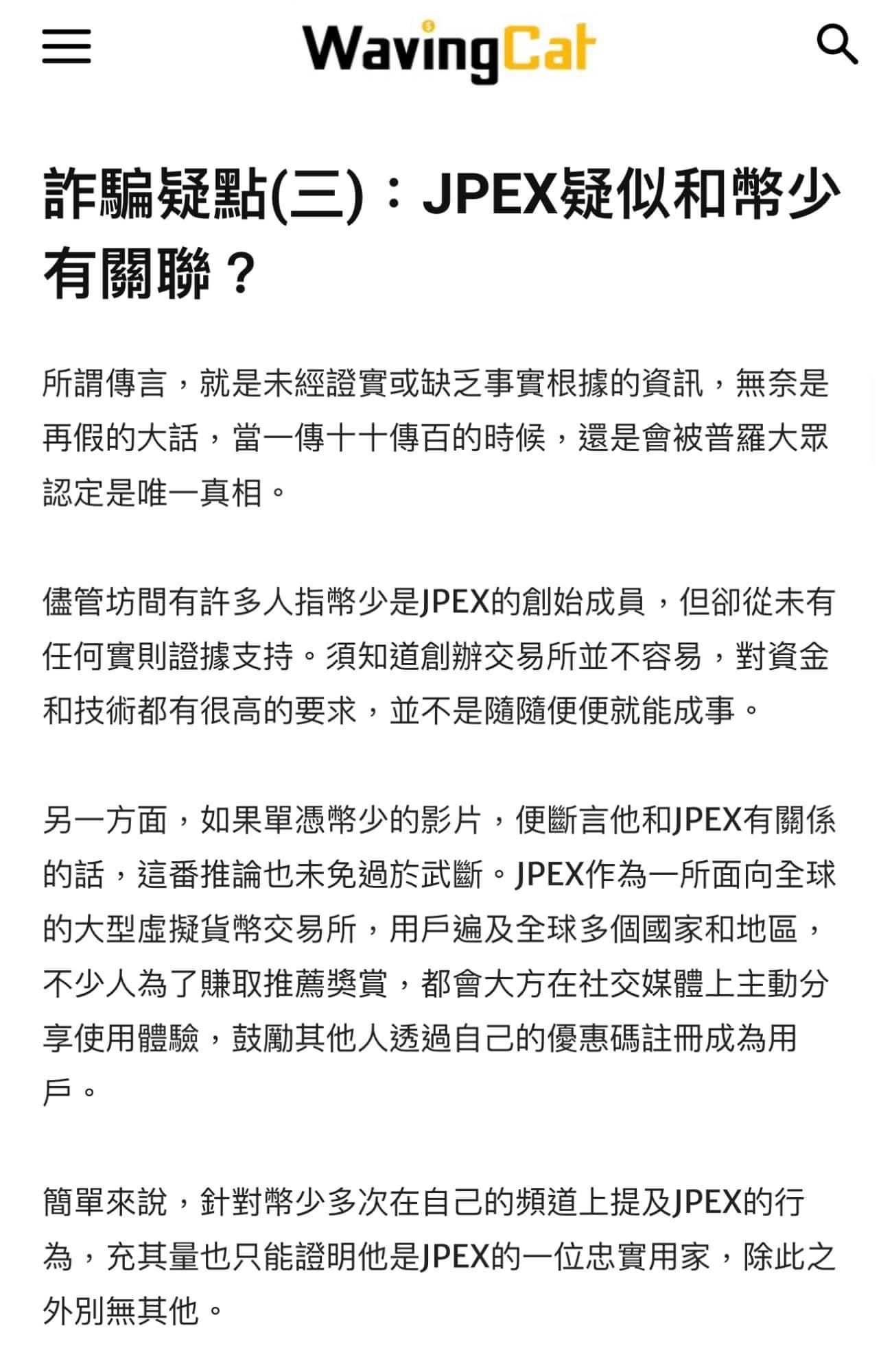 L 去 Google「JPEX騙局」。本來第一個搜尋結果是 AntiWeb3Scam.org 的踢爆長文,也被 WavingCat 上林作的洗白文爬頭登頂。