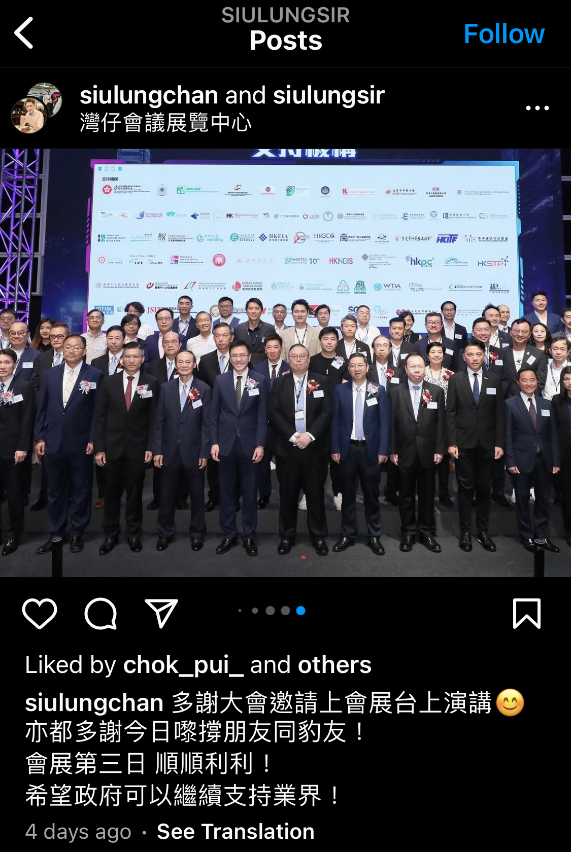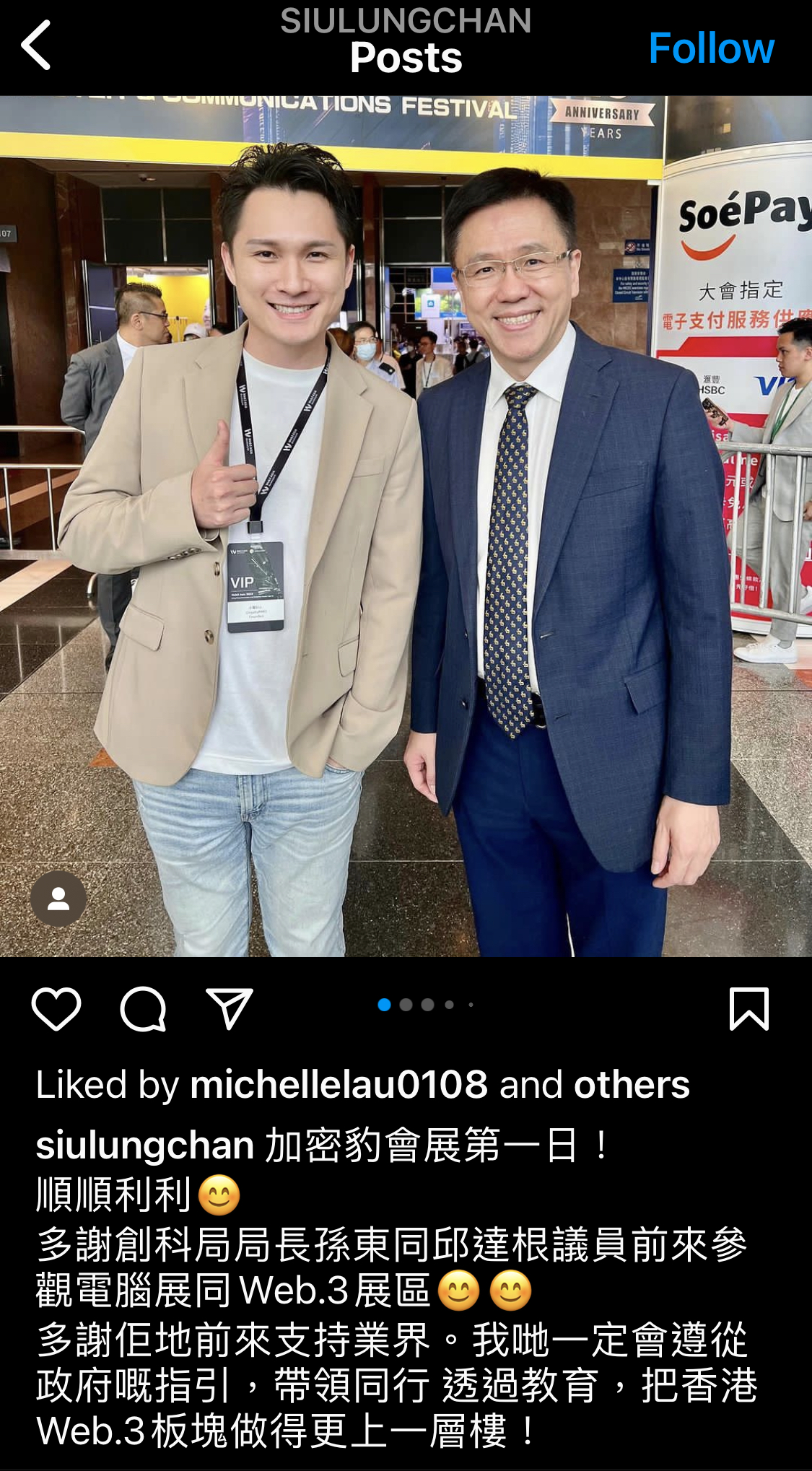 看著陳小龍拉著創科局局長孫東和邱議員的合照,我:「我相信孫東是不知情。看他笑得那麼真誠。不過姓邱的呢,知情也去,就不用再說什麼了。」查看孫東 Facebook,那天孫東出席的是會場 Web3 Asia 展區隔壁的 HKTAG 活動還有大灣區紅鳥企業家聯盟的一週年典禮,並非 Web3 Asia。陳小龍只是在現場看有沒有政府官員,有的就去拉合照,跟 FOMO Asia 活動中拉前財政司司長曾俊華合照的伎倆如出一轍。