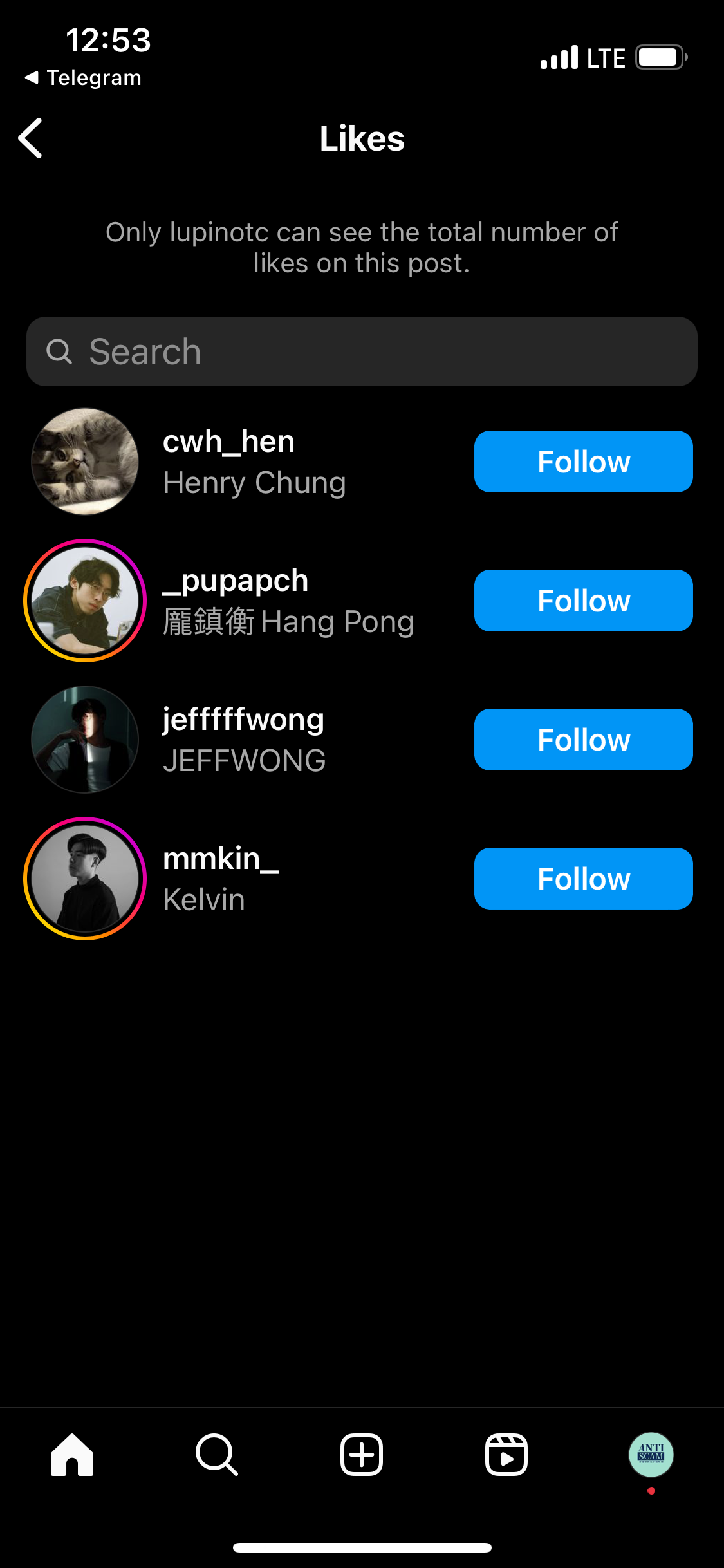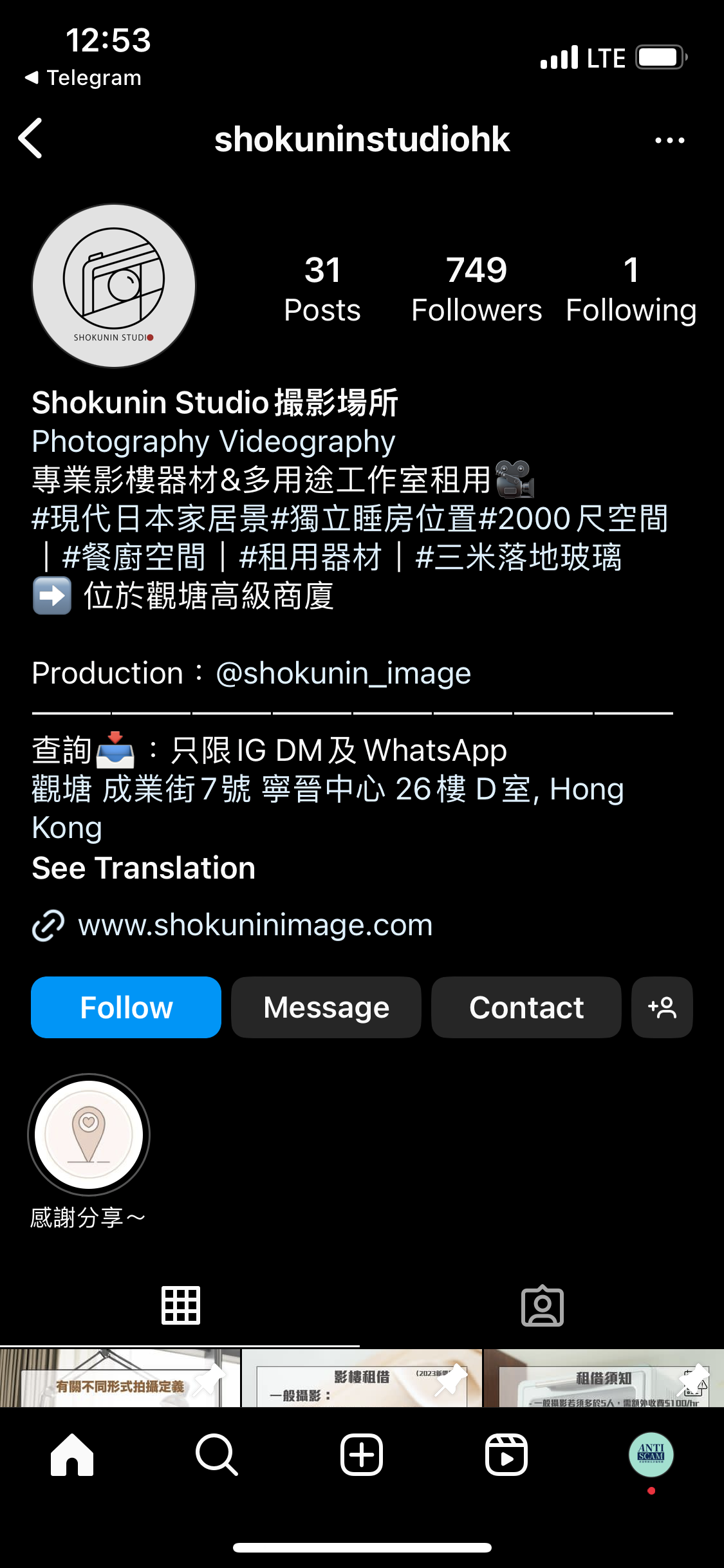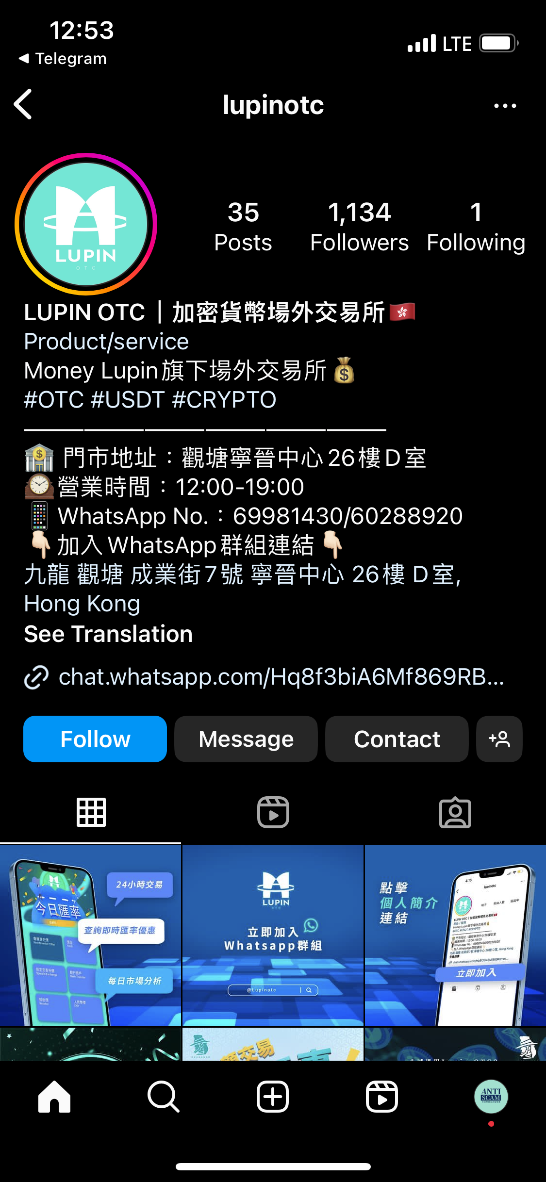 憑著「YouTuber 的第一個訂閱者就是自己」的定律,我查看在 LupinOTC 的第一個帖文點讚的人的帳戶。最早那篇帖文的 like 總是自己人給的。從他們的個人簡介中,就可以找到 LupinOTC 實質註冊公司的 Instagram:「LupicOTC 割龍友。他們在那個 OTC 地址,開設了攝影工作室。」