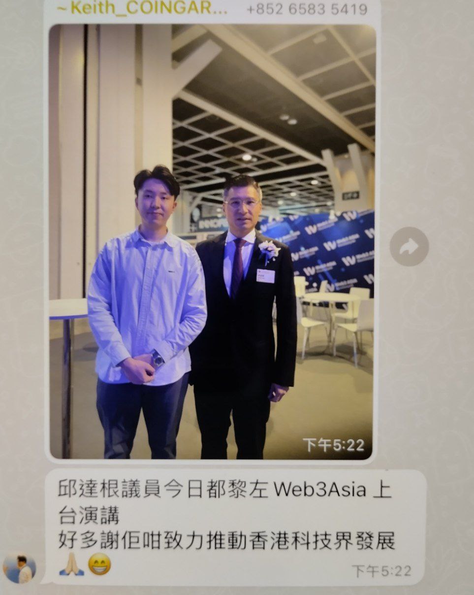 樂樂傳了 Coingaroo WhatsApp 群中,Keith 發出來的合照和描述:「邱達根議員今天都來了Web3 Asia 上台演講。感謝他致力推動香港科技界發展。」