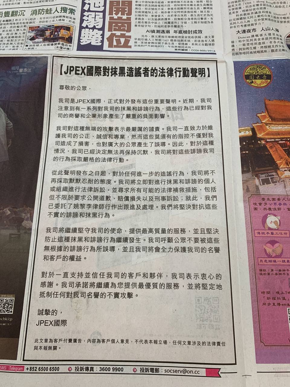 8 月 22 日,JPEX 發出「JPEX 國際對抹黑造謠者發出法律行動聲明」,指坊間有誹謗行為,對 JPEX 的商譽和企業形象產生嚴重的負面影響,會採取法律行動。該聲明不只在 JPEX 官網發出,還有在報章賣廣告。
