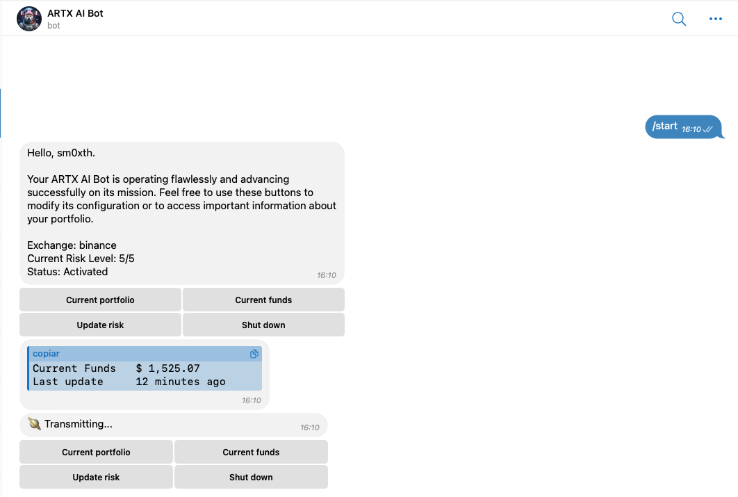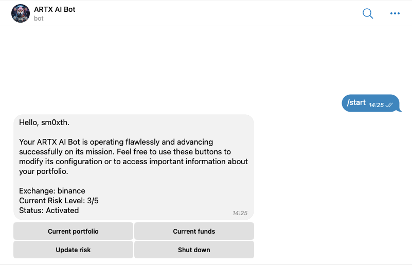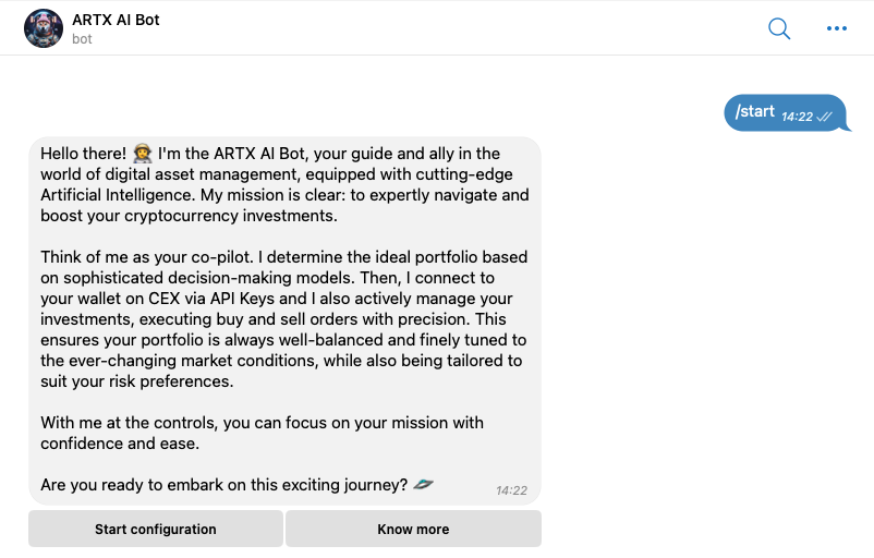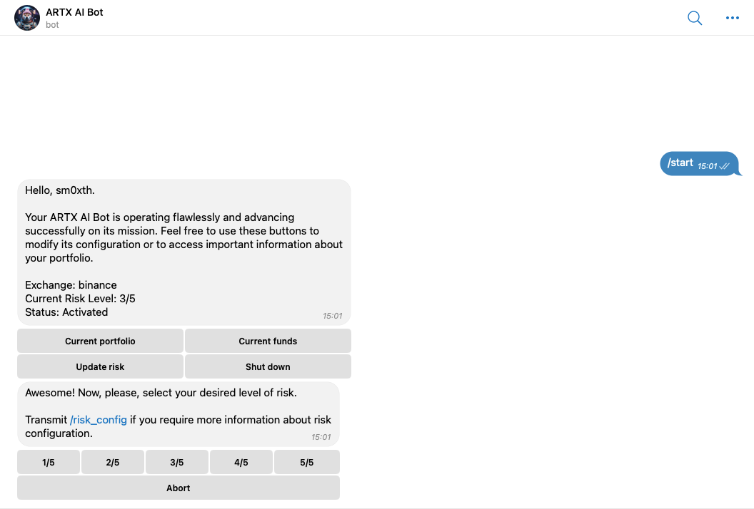 By accessing the bot via Telegram (@artx_ai_bot), the bot will guide you through the whole process in a self-explanatory manner, with all the necessary instructions to securely configure the API Keys and get it running in a matter of minutes.