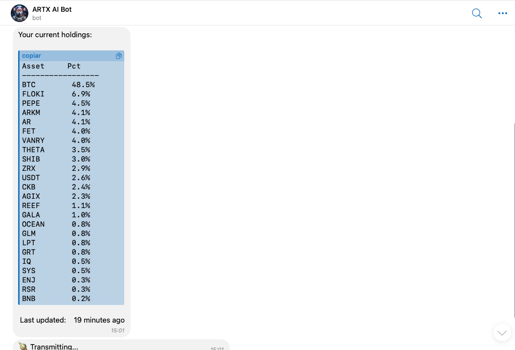 Once you initiate the ARTX AI Bot, it will start dynamically trading assets to align your portfolio with the AI-optimized portfolio calculated by its models.