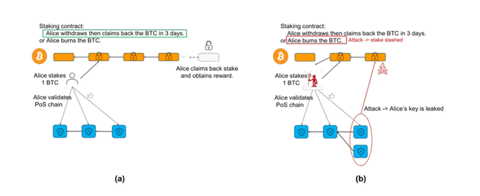 By calling OP_CSV (OP_CHECKSEQUENCEVERIFY, which allows setting a relative time lock based on the transaction’s sequence number, indicating that the UTXO can only be spent after a certain relative time or number of blocks), time locks can be implemented. Combined with OP_CTV, this can achieve staking, unstaking (allowing the staker to spend the locked UTXO after the staking period is met), and slashing (forcing the spending of UTXO to a locked address if the staker acts maliciously, making it non-spendable, similar to a black hole address).