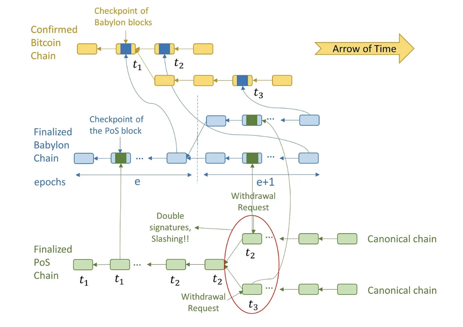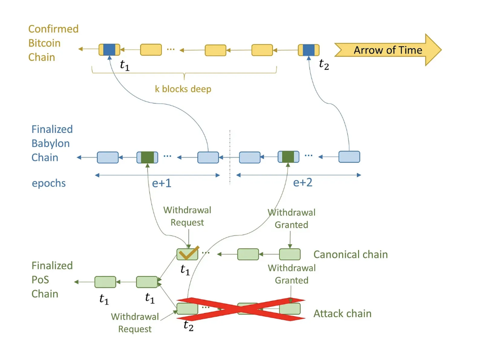 · Withdrawal Rules: To withdraw, validators send a withdrawal request to the PoS chain. The PoS block containing the withdrawal request is then checkpointed by Babylon and subsequently by Bitcoin, assigning it timestamp t_1. Once the Bitcoin block with timestamp t_1 reaches a depth of k, the withdrawal is granted on the PoS chain. If a validator with withdrawn stakes attempts a long-range attack, the blocks on the attack chain can only be assigned a timestamp later than t_1. This is because once the Bitcoin block with timestamp t_1 reaches a depth of k, it cannot be rolled back. By observing the order of these checkpoints on Bitcoin, PoS clients can distinguish the canonical chain from the attack chain and ignore the latter.