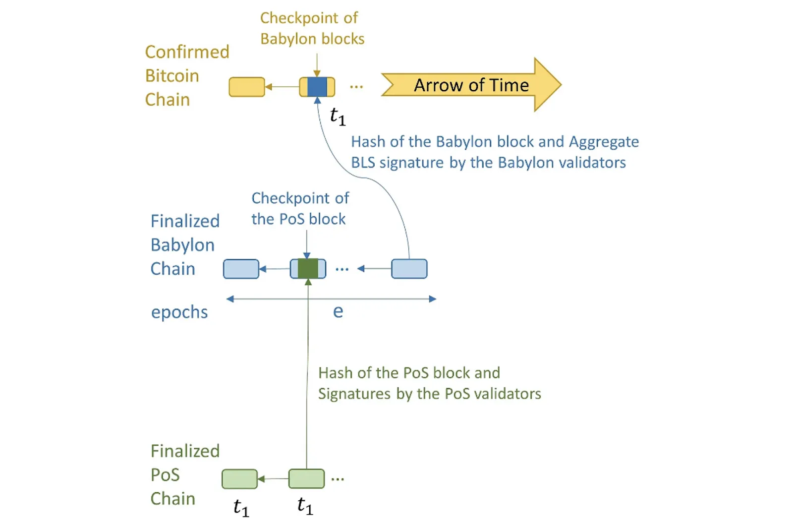· Checkpoints: Only the last block of a Babylon epoch is verified by Bitcoin. A checkpoint consists of the block’s hash and a single aggregated BLS signature, corresponding to the signatures of the two-thirds majority of validators who signed off on the block for finality. Babylon checkpoints also include the epoch number. PoS blocks can assign Bitcoin timestamps through Babylon checkpoints. For example, the first two PoS blocks are checkpointed by Babylon blocks, which are then checkpointed by a Bitcoin block with timestamp t_3. Consequently, these PoS blocks are assigned the Bitcoin timestamp t_3.