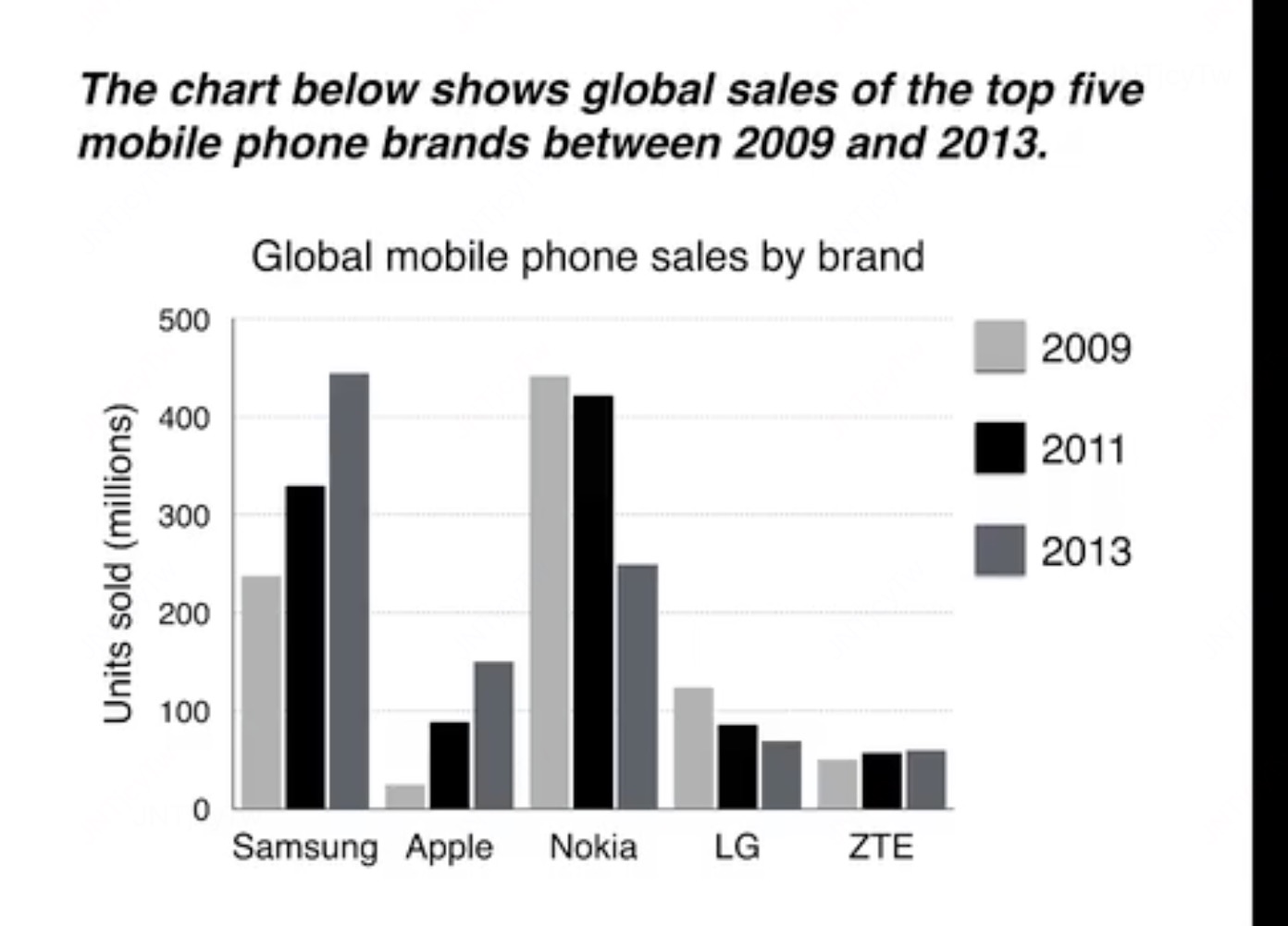 It is clear that Nokia sold the most mobile phones between 2009 and 2011. but Samsung become the best selling brand in 2013. Samsung and Apple saw the biggest rises in sales over the 5-year period.