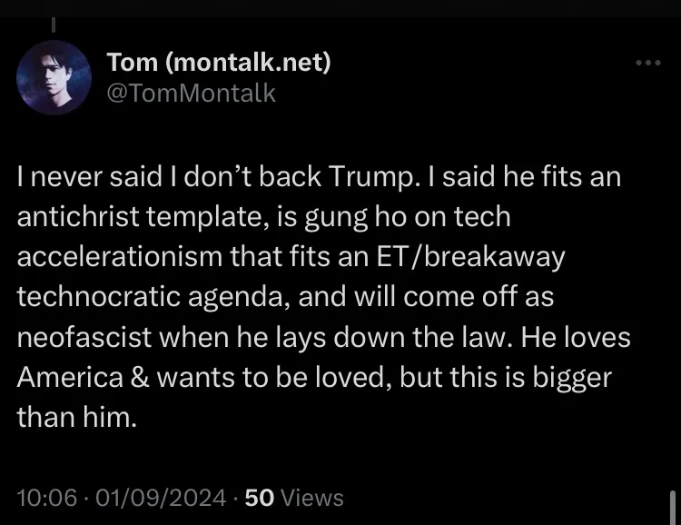 So even if Trump does support AI acceleration, which has an anti-human/satanic underpinning, and even if some of his practices are authoritarian in nature, my argument is that the best option is to back him, borgify him, enhance him, guide him, and form a wider alliance against non-human intelligence aligned global policies.