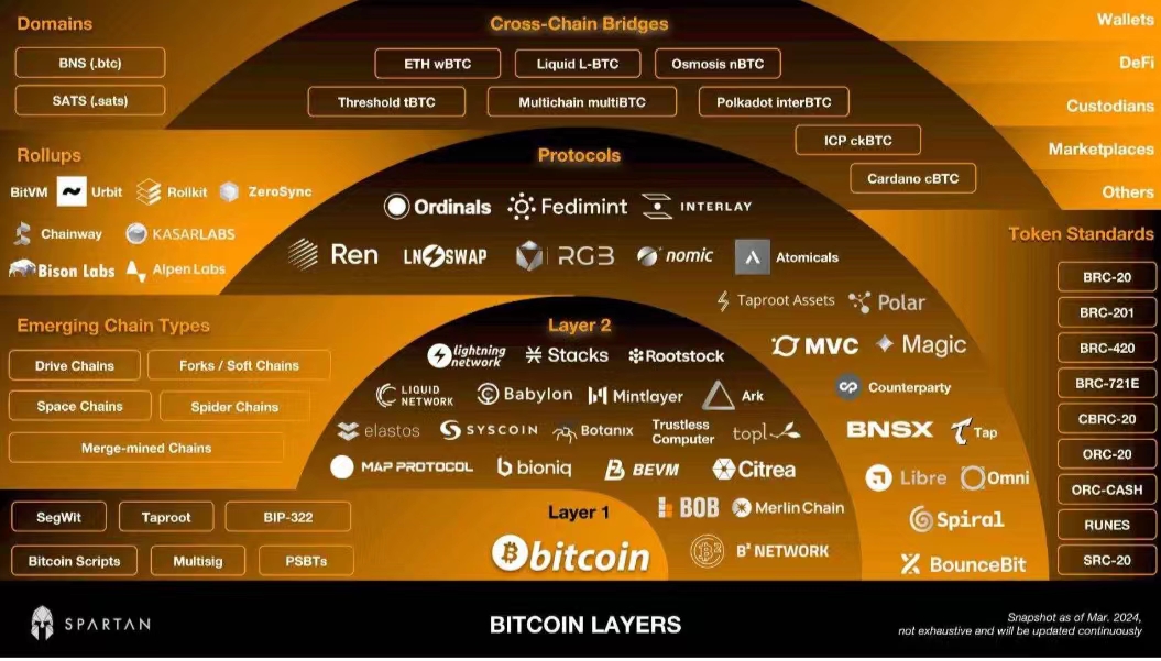 至于比特币的技术发展,更多的关注点还是停留在“数字黄金”阶段。2023年末,BRC-20铭文的火爆,让大众的注意力重新回到比特币上,开始思考比特币生态是否还能继续催生出不同的应用场景。