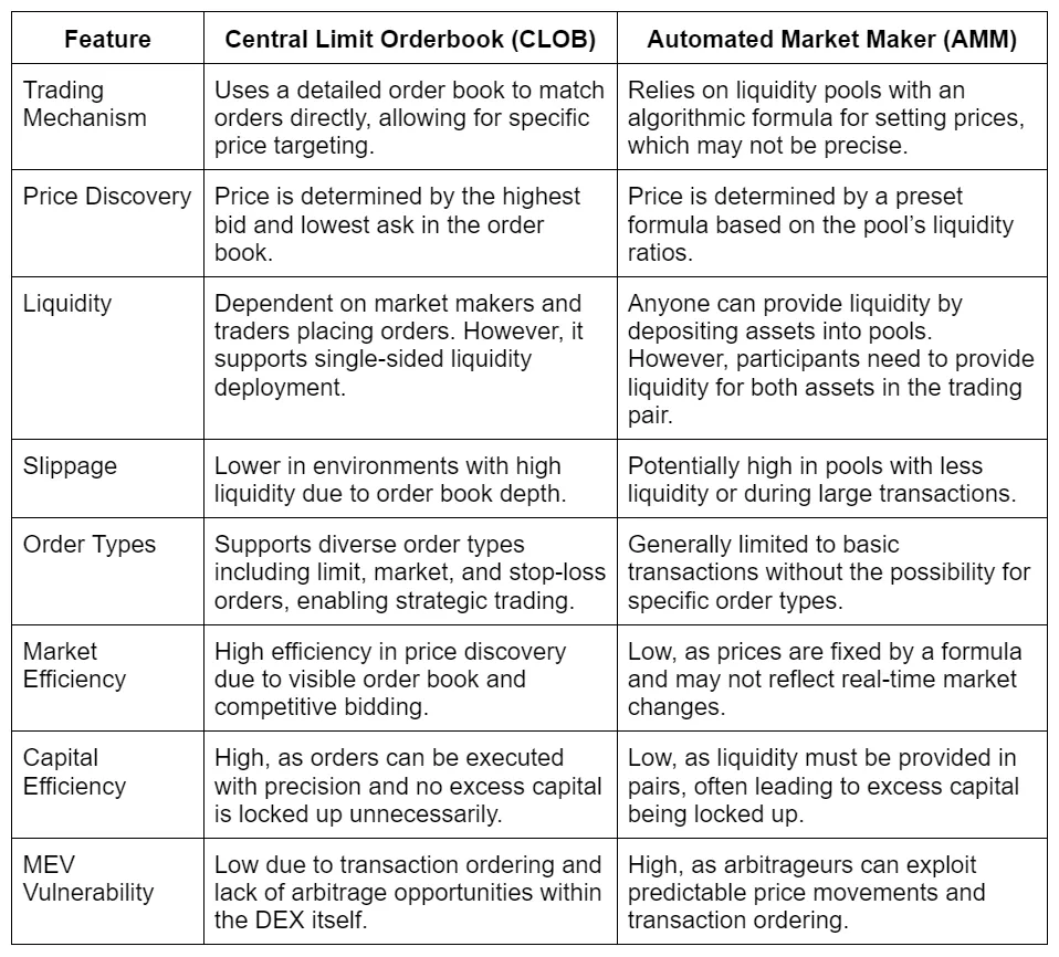 As the DeFi landscape is evolving, the choice of trading mechanism can significantly impact both the user experience and the market effectiveness. Right now, Central Limit Order Books (CLOBs) and Automated Market Makers (AMMs) stand out as prominent frameworks. This section delves into a detailed comparison of these two models, highlighting key features and differences to explore which system might be more advantageous for DeFi participants.