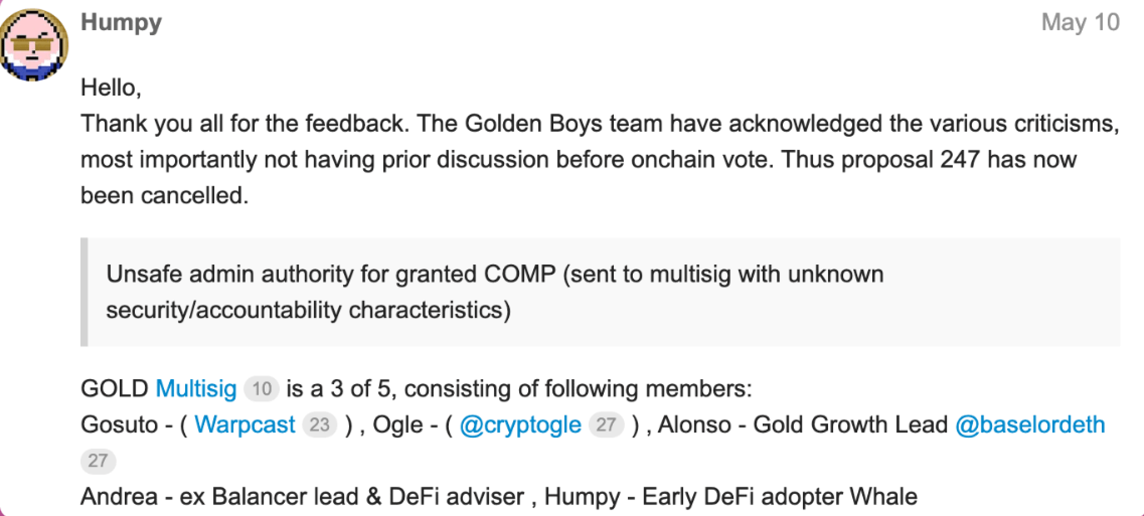 In the wake of Proposal 289, a community member alextnetto, who floated drastic options: transfer admin to a trusted multisig, strip voting rights from the goldCOMP delegatee, or even mint a new governance token excluding those involved.
