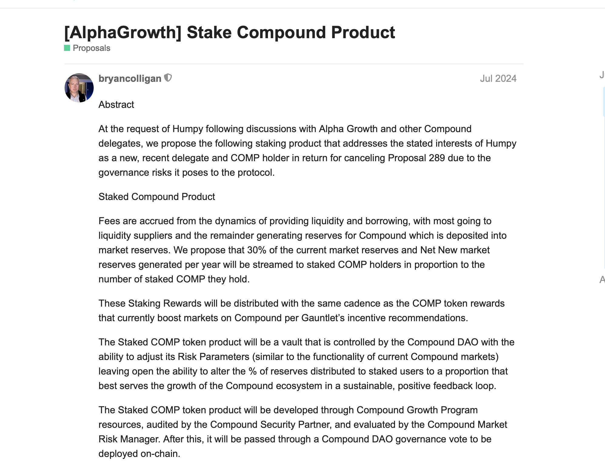 On July 30, Bryan Colligan (Compound’s growth lead at AlphaGrowth) announced an alternative proposal following direct dialogue with Humpy. In exchange for rescinding Proposal 289, the Compound Growth Program proposed a revamped staking mechanism: distribute 30% of all current and future market reserves to COMP stakers.
