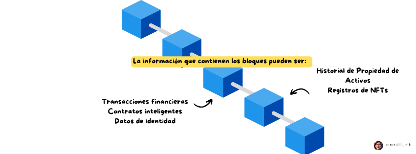 La información que contienen los bloques, puede variar, desde información de transacciones financieras hasta historiales de propiedad de activos.