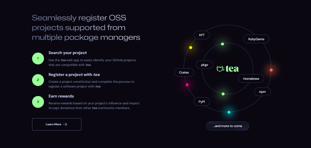 At tea, we're revolutionizing the open-source landscape by addressing a critical issue – the lack of tangible rewards for the dedicated efforts of open-source maintainers and contributors. tea's decentralized protocol not only acknowledges the invaluable contributions of developers but also introduces a trustless system for them to capture the value they create. With tea, we're redefining the open-source software ecosystem, making it sustainable, transparent, and rewarding for all its contributors.
