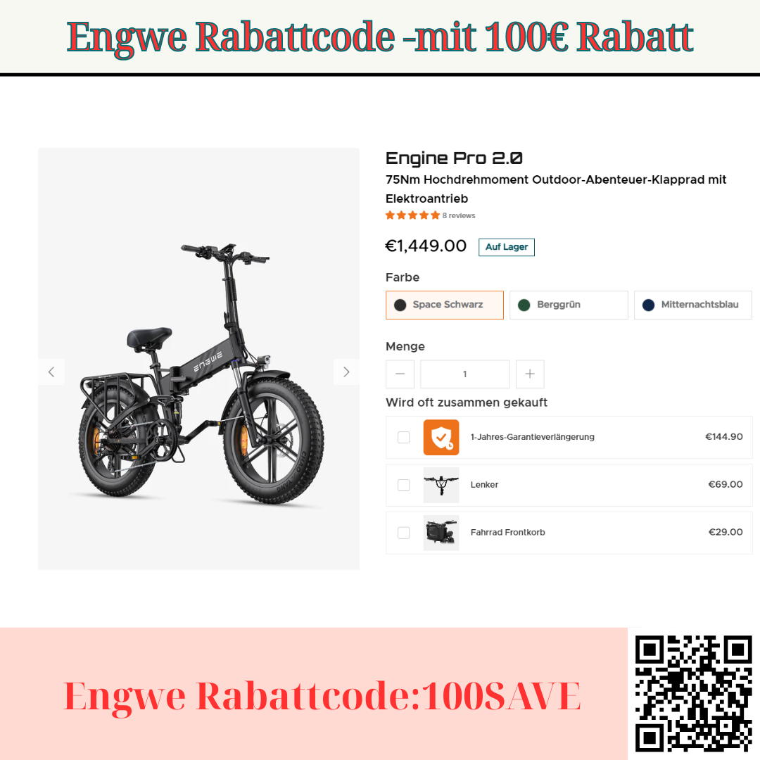 🚲 Mit dem Engwe Rabattcode: 100SAVE sicherst du dir 100 € Rabatt auf dein nächstes Engwe E-Bike – ideal für stressfreie Fahrten in der Stadt und darüber hinaus! Ob zur Arbeit, zum Einkaufen oder für entspannte Wochenendausflüge – dein neuer Begleiter wartet auf dich bei engwe-bikes.de.