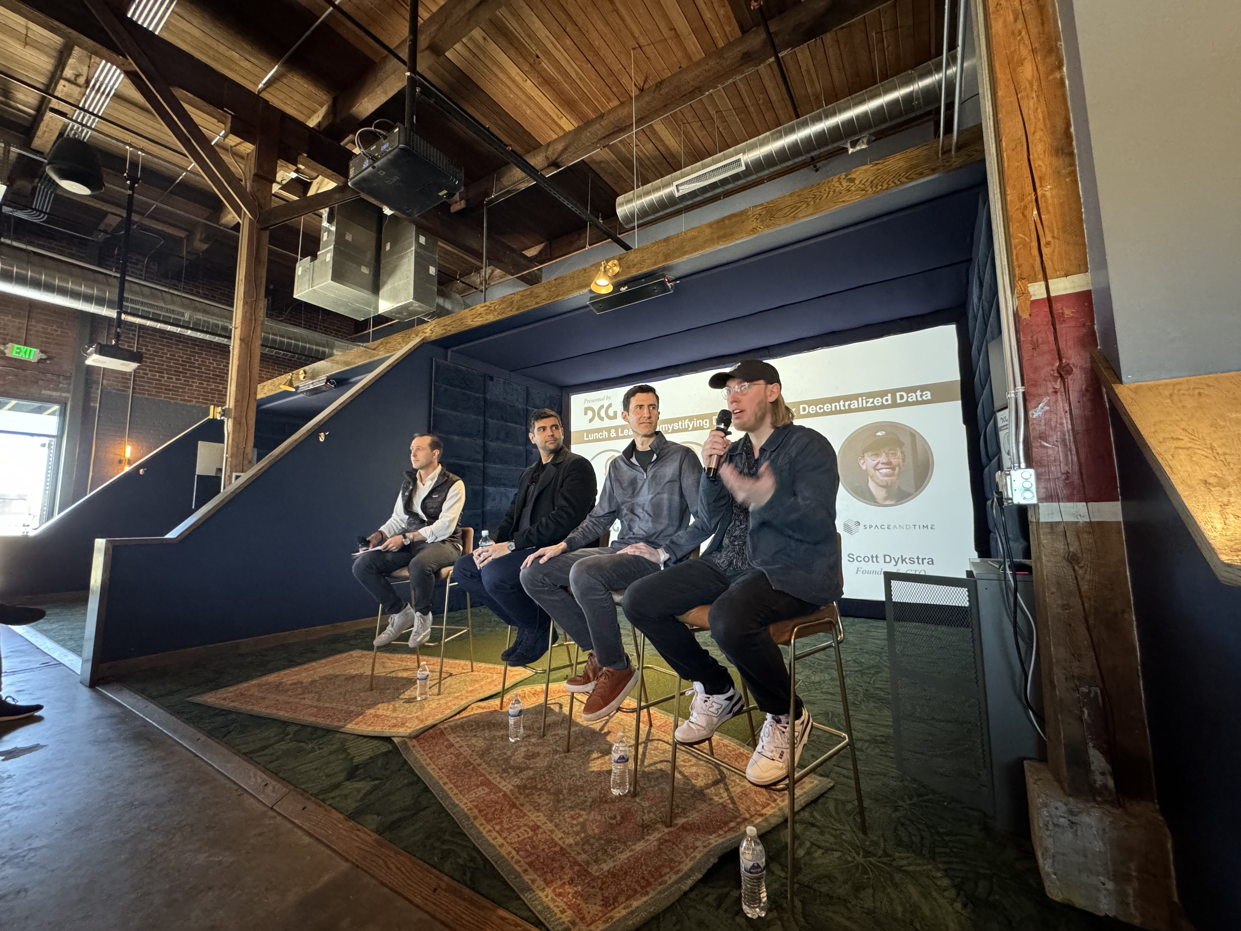 会议第二天,SxT 投资者DCG主持了一场小组讨论,由 Scott 以及 Livepeer 和 Bittensor 的创始人参加。该小组探讨了人工智能的未来,以及如何利用区块链、DePIN 网络和去中心化数据解决方案来确保以负责任的方式部署和使用人工智能。