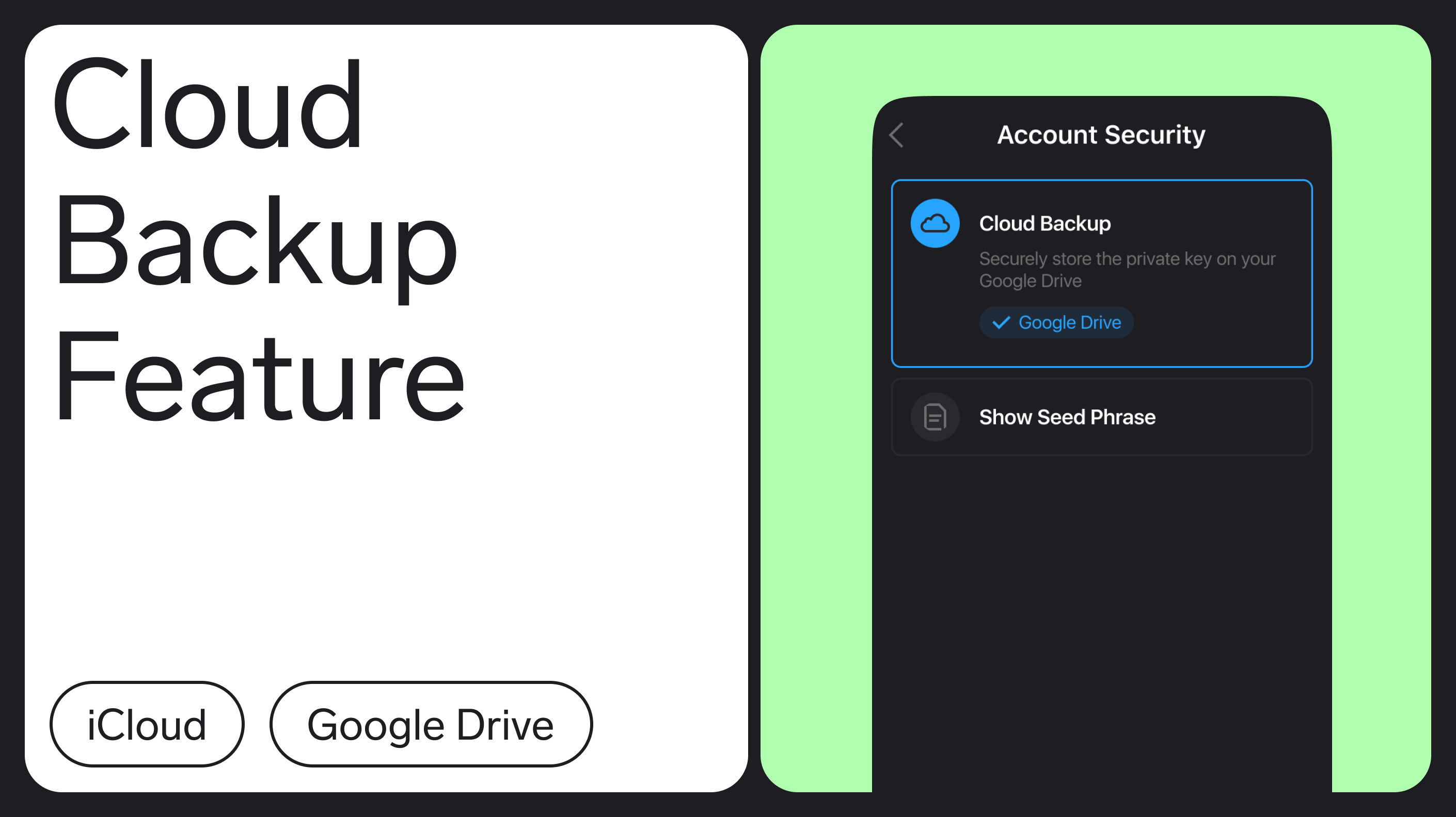 This method, sometimes called a centralized approach to seed phrase storage, is not connected to AA. When you back up your seed phrase, it’s stored in iCloud for iOS or an equivalent for Android, like Google Drive within the Fuelet wallet app. This is convenient for newbies but does pose risks related to centralized entities. You can read more about them here, but let’s be honest - the chances that Google gets hacked are lower than those of losing a seed phrase.