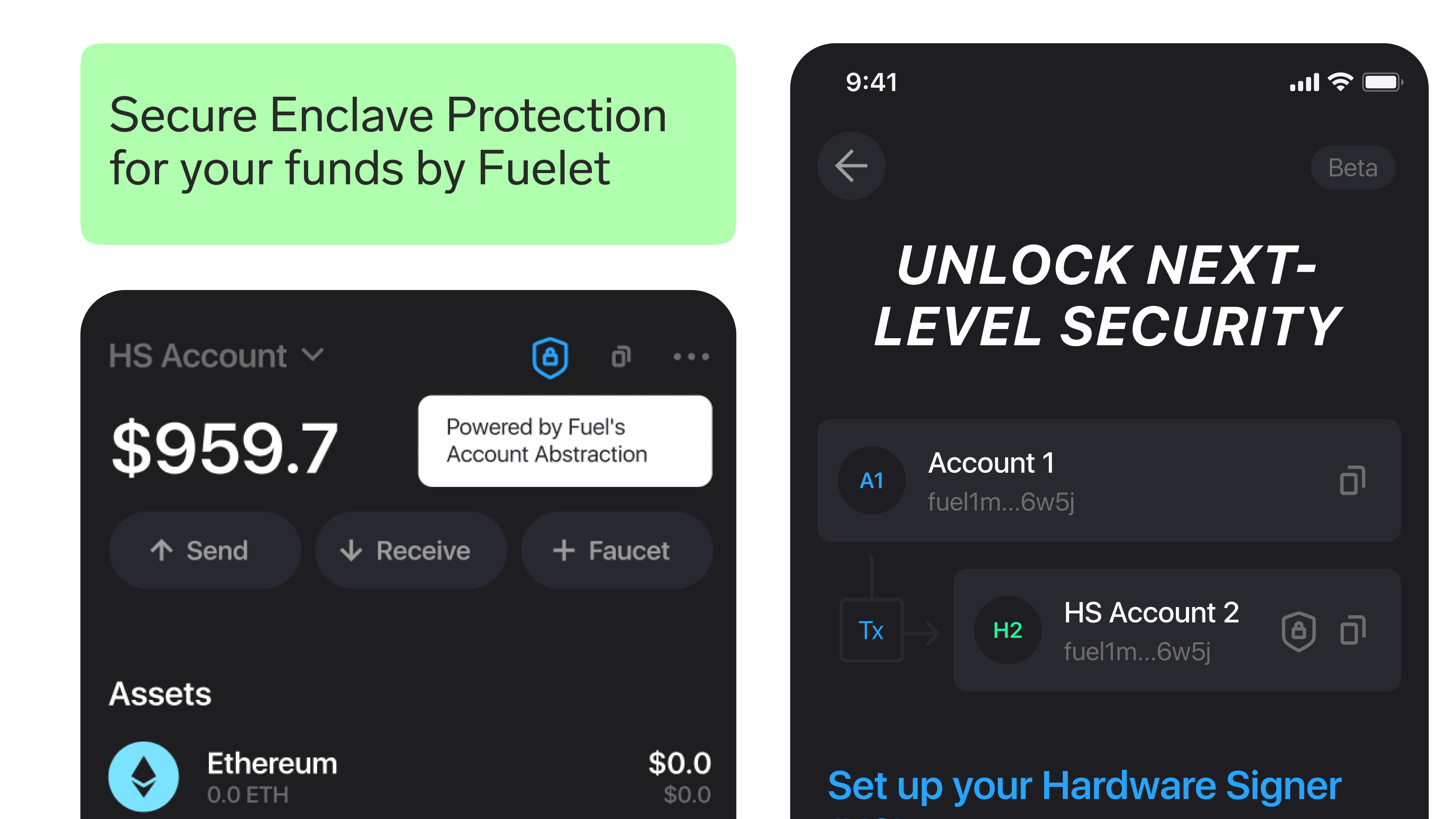 Fuelet Wallet will implement two features powered by Secure Enclave, a special chip that generates your private keys and protects them with biometrics in your iPhone. That ensures that no one except you can access them. Fuel’s Account Abstraction with predicates allows you to use it to keep your funds secure.