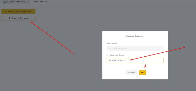 • Далее слева мы тыкаем на Create Dataset и даём второй никнейм — жмём OK