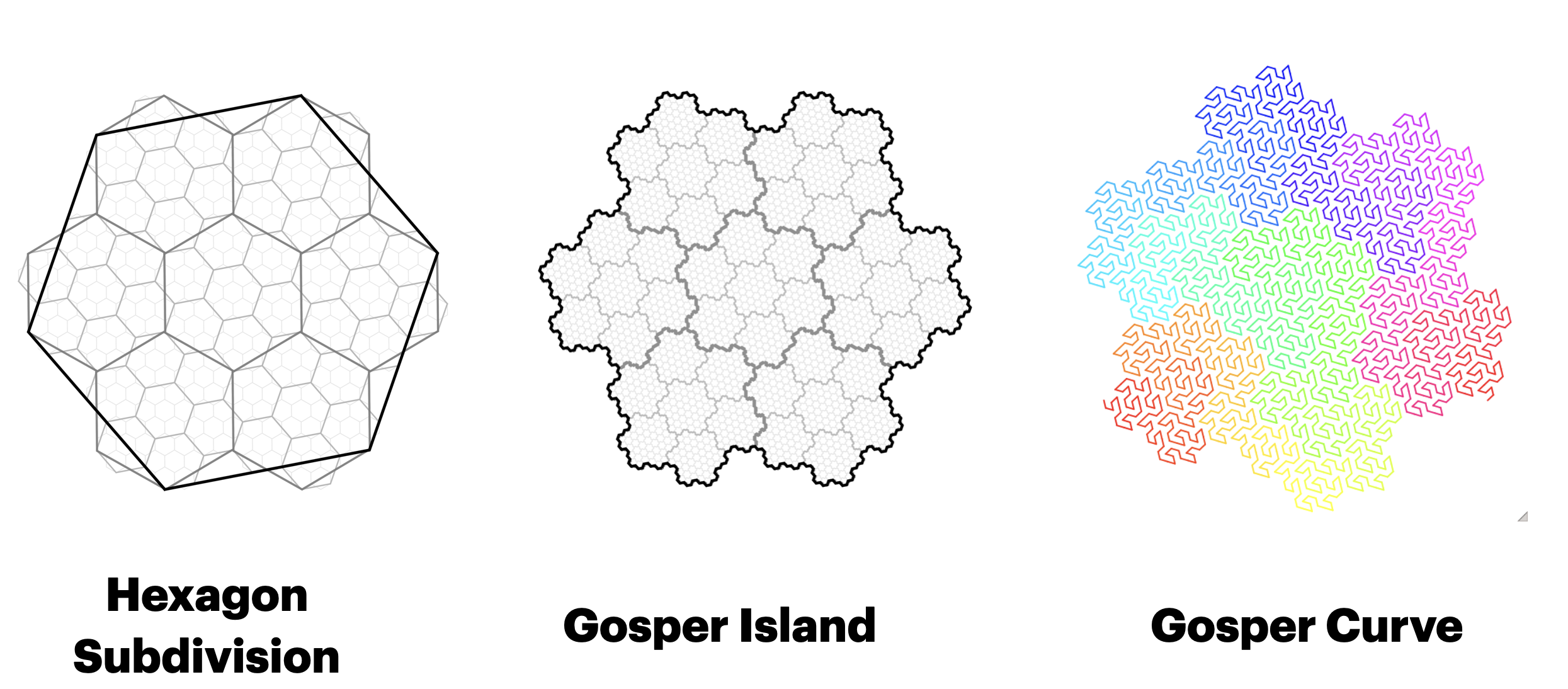 Of course, this uses only the original four hexagons. But one neat thing about a hexagonal grid is that it can be subdivided into smaller hexagons to any resolution we desire. The only issue is that hexagons can’t be perfectly subdivided into smaller ones and there will be some weird overlaps between hexagonal children (in Uber’s H3 system cells will change their parents depending on the resolution). This can be avoided by using instead the Gosper Island, a fractal which is the result of an infinite subdivision of hexagons. It has the same six-sided connectivity of the hexagon, but it can be split into seven perfectly self similar copies of itself.