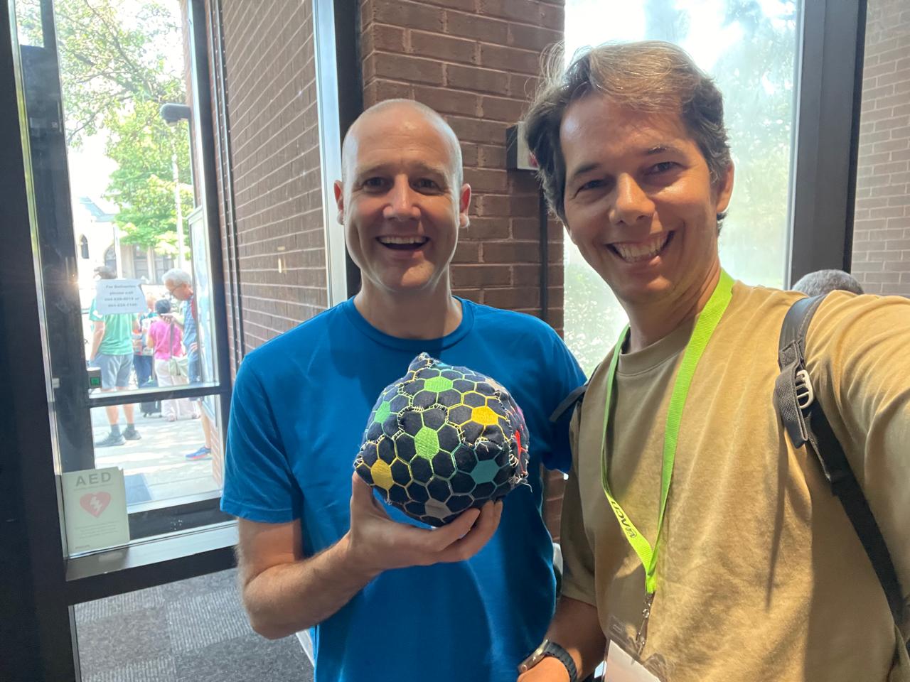 Instead I was pleasantly surprised to bump into him on the very first day. He was there the whole conference, quite approachable and friendly with everyone, so I ended up giving him the badly sewn together ball the first day of the conference. And I guess this picked his curiosity enough for him to attend the talk and ask me a question.