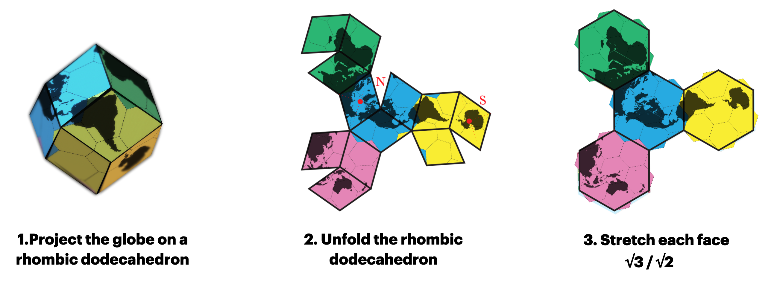 In this paper we are picking the Rhombic Dodecahedron instead. I’ve chosen this shape because it’s more “roundish” than the aforementioned shapes used in Rus’ paper. A rhombic dodecahedron can also tile a space like the hexagon tiles the plane, so it feels more like the 3D equivalent of the hexagon. But most importantly for our purposes it has 12 faces which can be colored in 4 main “groups”. We then project the earth in the Rhombic Dodecahedron (based on Carlos Furuti’s projection). Finally, we unwrap the rhombic dodecahedron in it’s corresponding network. It gets its name from its “Rhombi”-shaped like faces which are almost a golden rhombus (two equilateral triangles) so let’s stretch each rhombus a little bit until they all fit together.