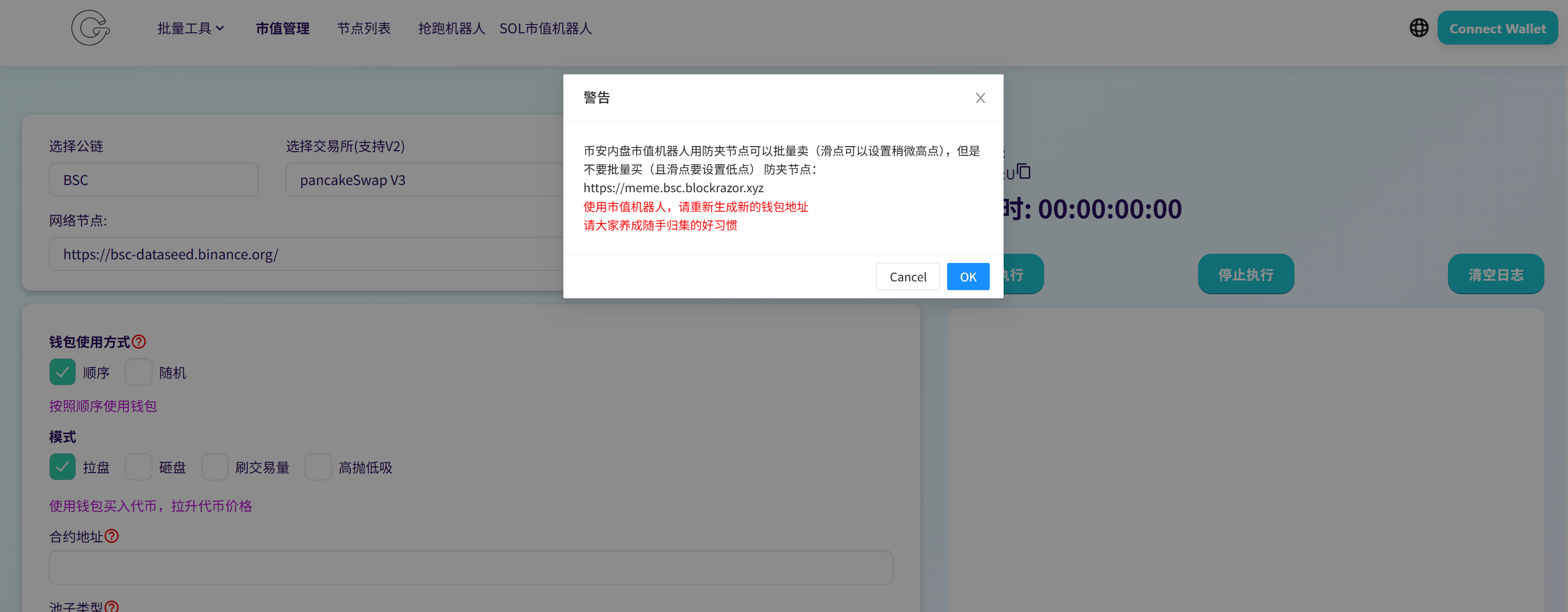 访问 https://www.gtokentool.com/bot。确保账户已完成必要的KYC(视地区要求)或绑定钱包。 导入钱包:在机器人界面点击“Import Wallet”导入币安智能链(BSC)兼容的钱包(如MetaMask)。 建议每次导入少于100个钱包,以确保操作稳定。 点击“Refresh Wallet”刷新钱包余额,确认资金充足;如需删除钱包,点击“Delete”按钮。 选择交易对和池:在机器人界面选择目标代币和PancakeSwap V3的交易池。 使用“Check Pool”按钮确认交易池ID和当前代币价格,确保选择正确的流动性池。 设置交易参数:交易模式:拉盘(Pull):设置买入金额(以SOL或BSC链上的原生代币计)和目标价格(高于当前价格)。 砸盘(Dump):设置卖出代币数量和目标价格(低于当前价格)。 增加交易量(Volume Boost):设置随机买卖的金额范围。 金额(Amount):拉盘模式:输入花费的原生代币数量(如BNB)。 砸盘模式:输入卖出的代币数量。 全部交易(All):一次性买入或卖出全部代币,不考虑价格或滑点。 随机交易(Random):根据设定金额范围随机买卖。 执行交易:确认参数后,点击执行交易,机器人将根据设置自动操作。 交易过程可通过底部的日志查看实时价格和交易状态。 监控与调整:定期检查日志,点击“Clear Log”清除无用信息。 根据市场情况调整目标价格或交易金额,优化策略。 使用“Refresh Wallet”监控钱包余额变化。 停止或退出:若需停止策略,暂停机器人或删除钱包。 确保资金安全,定期检查钱包和交易记录。